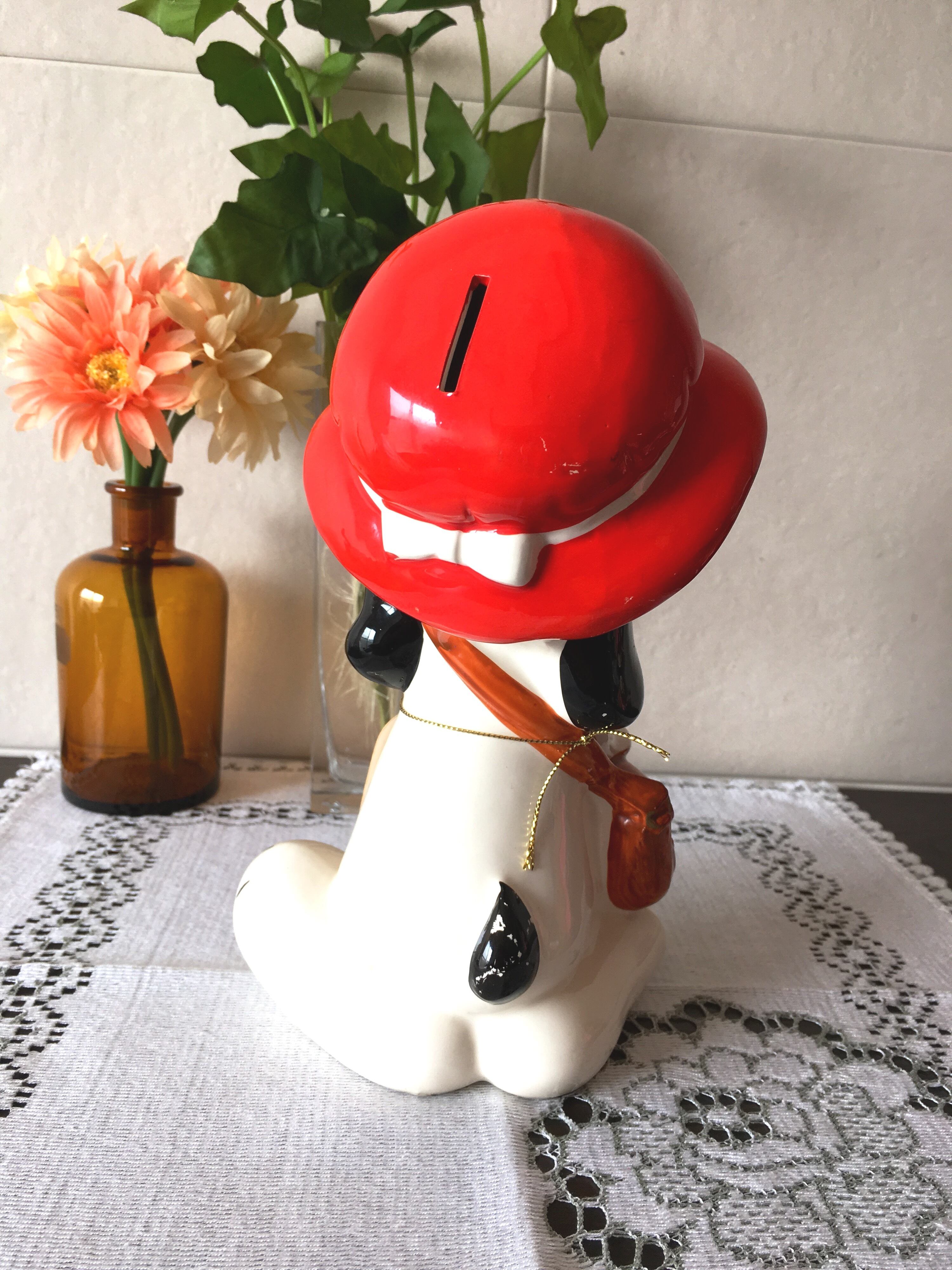 赤い帽子にフェルトの長いまつ毛が可愛い、陶器製の貯金箱です。
