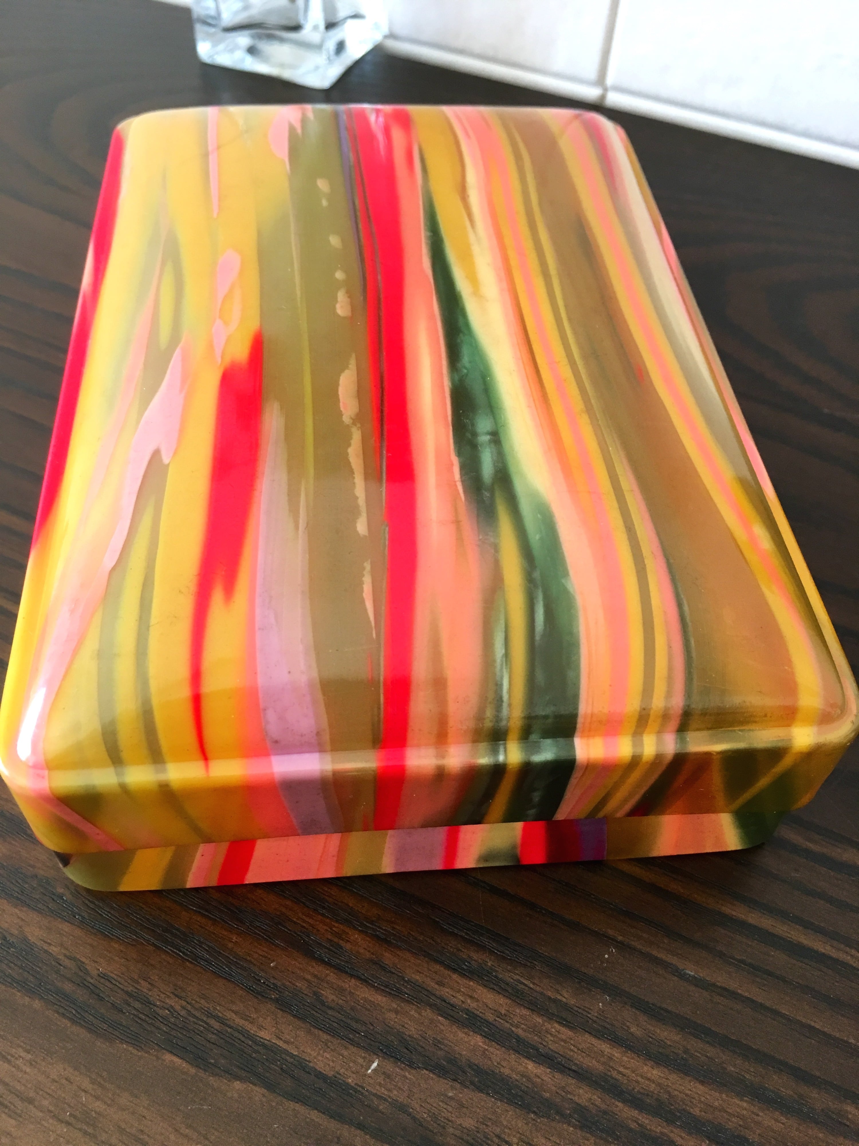 ストライプのような縞模様が素敵なセルロイド製の裁縫箱です。