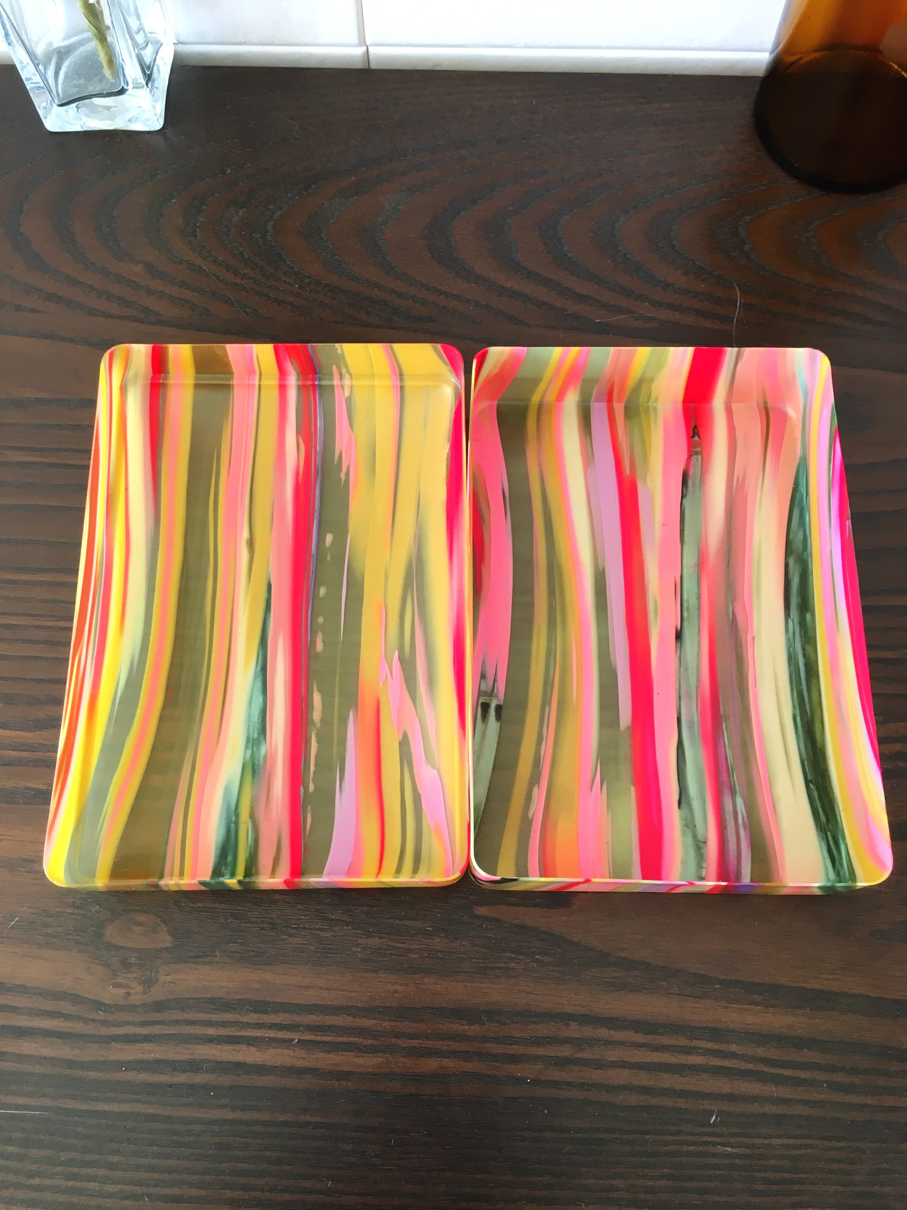 オレンジ寄りの少し透き通ったイエローベージュに、赤やピンク、パープルやグリーンなど様々な色がグラデーションになっています。