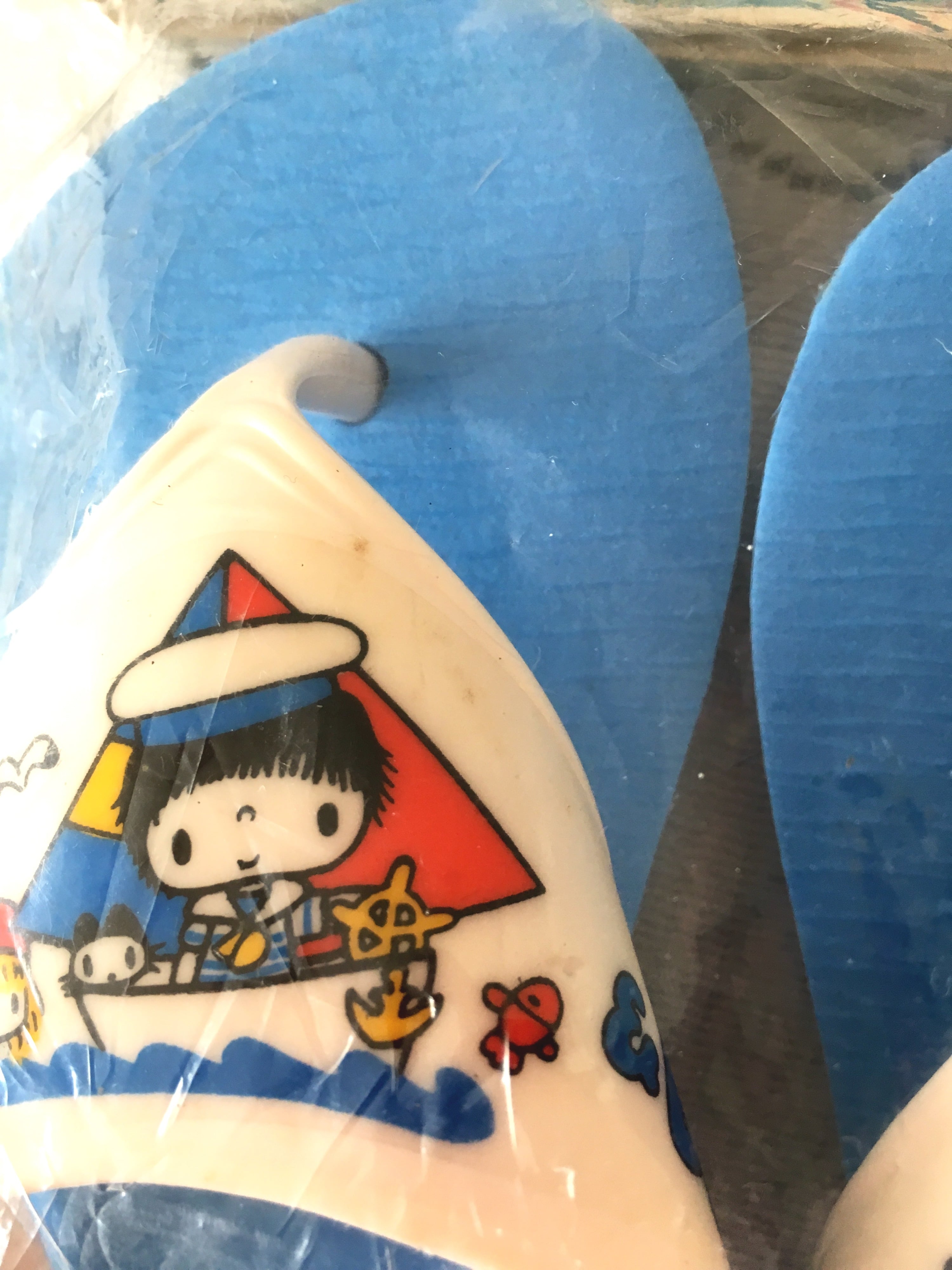 未使用デッドストック品ですが、包装材は傷みがあります。中のビーチサンダルに、拭けば落ちそうな汚れが少しありますが、開封せずこのままお送りさせていただきます。