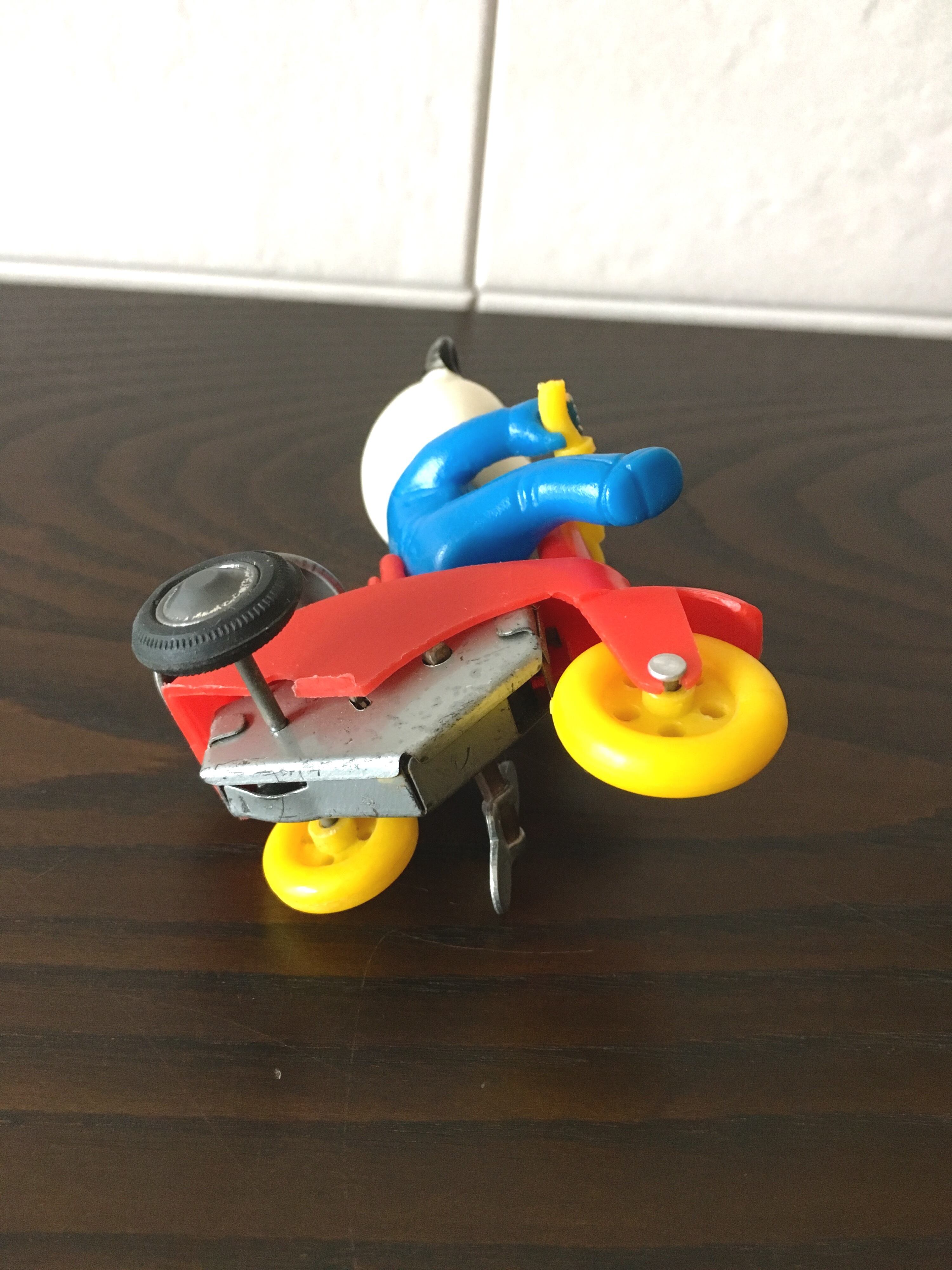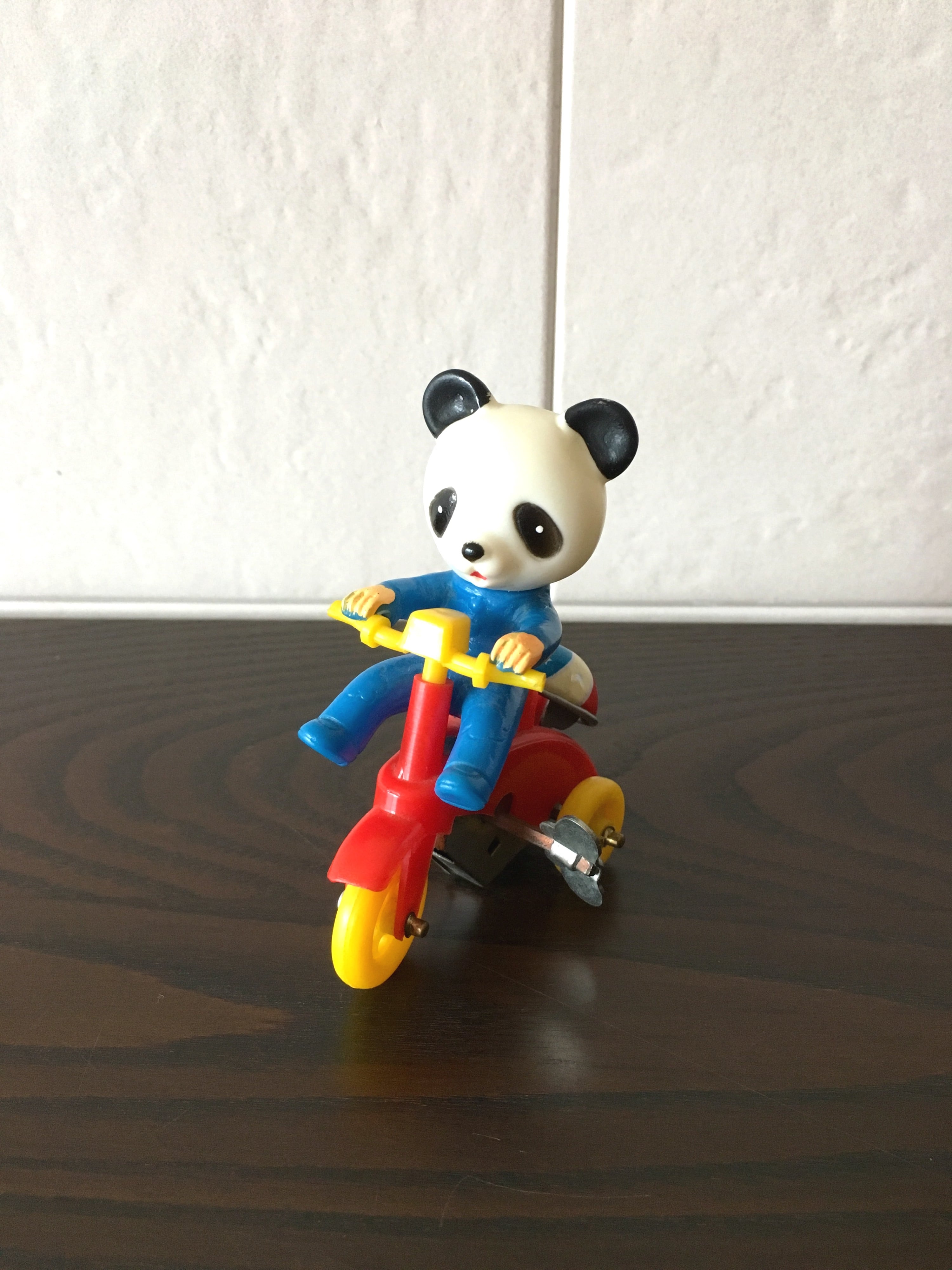 顔はパンダ、体はブルーのつなぎを着て三輪車にまたがる姿がたまらなく可愛い、ブリキ製のゼンマイのおもちゃです。