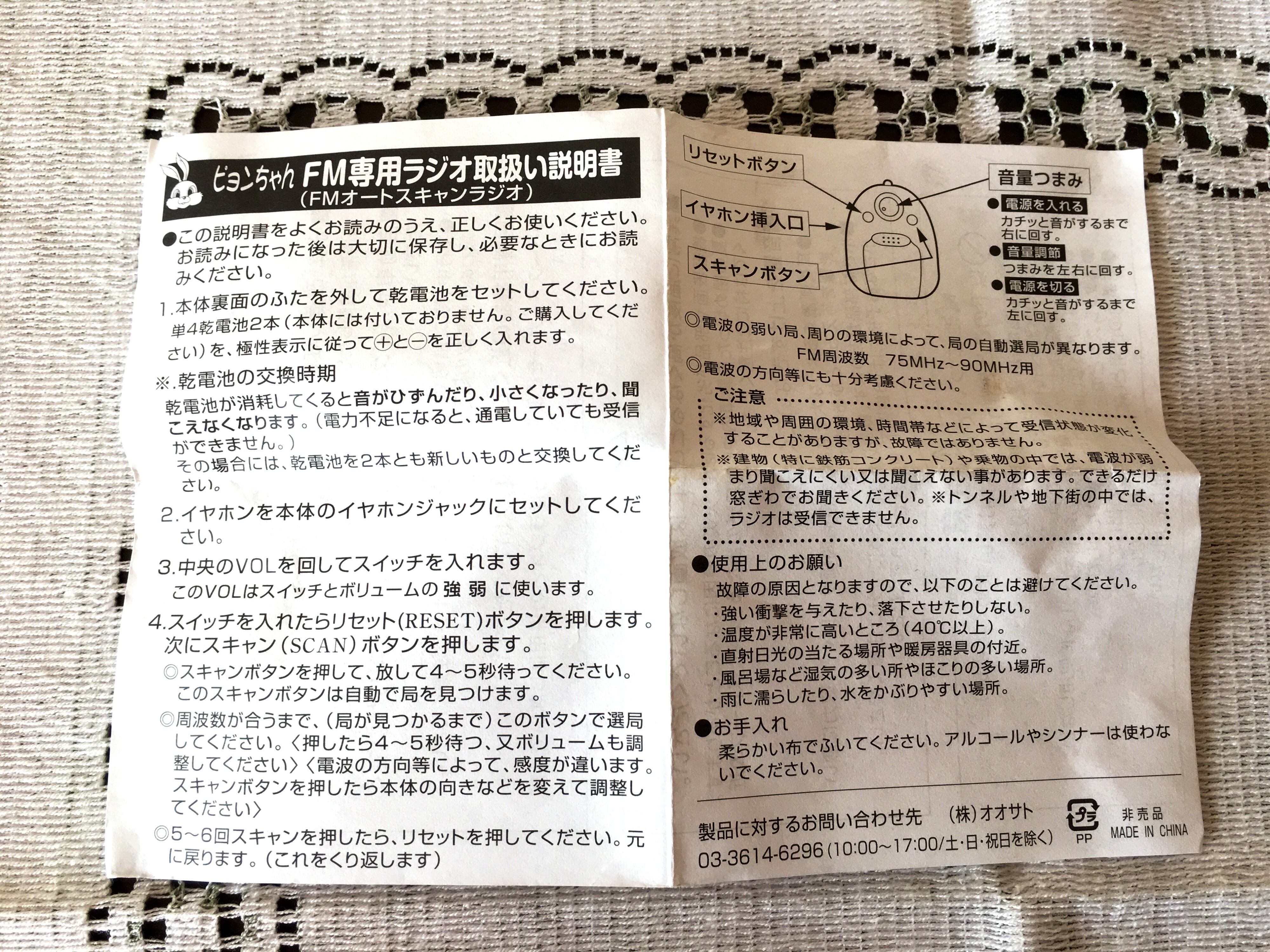 おまけで、こちらもピョンちゃんのノベルティ、FM専用ラジオをお付け致します。