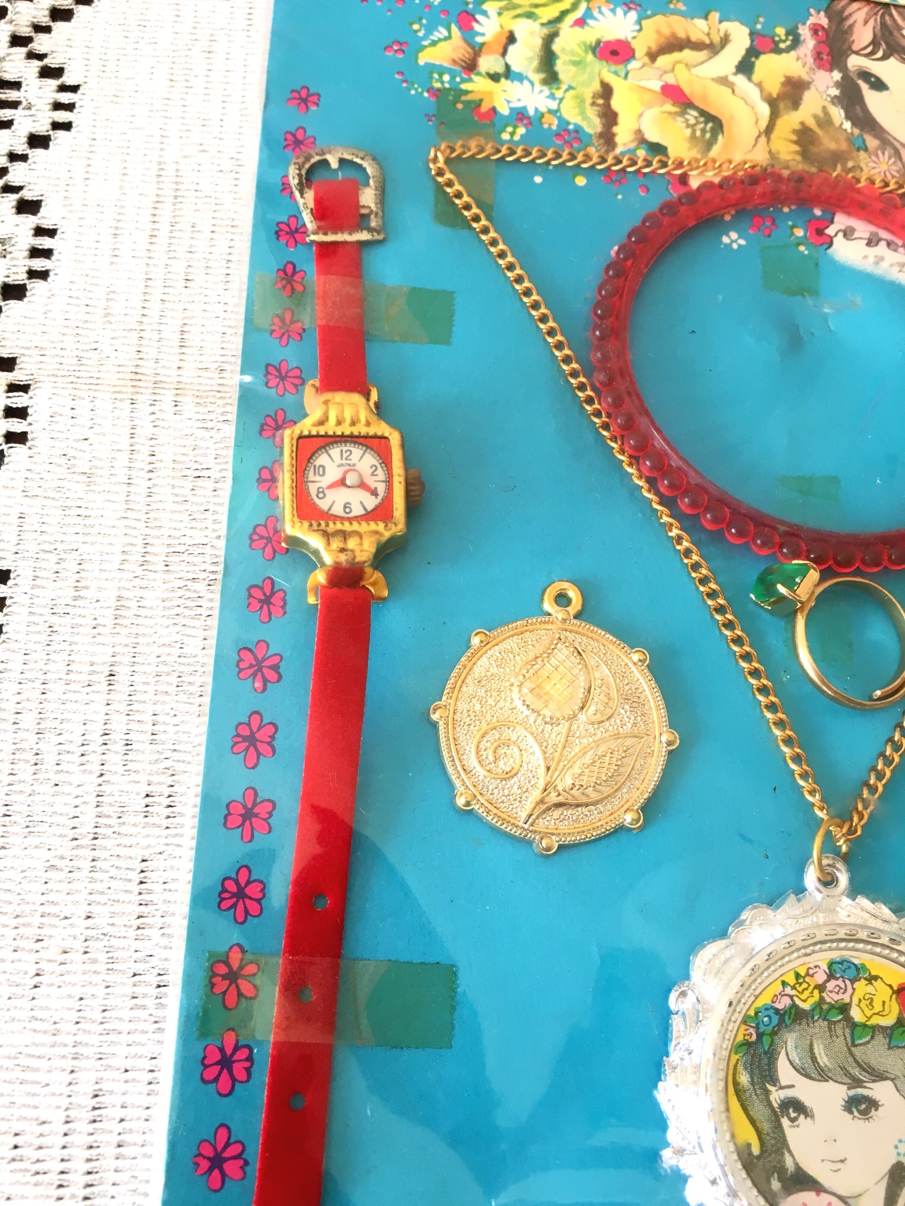 昭和の女の子の憧れ、ネックレスや指輪、ブレスレット、腕時計などの宝飾品がたくさん入ったデラックスアクセサリーセットです。