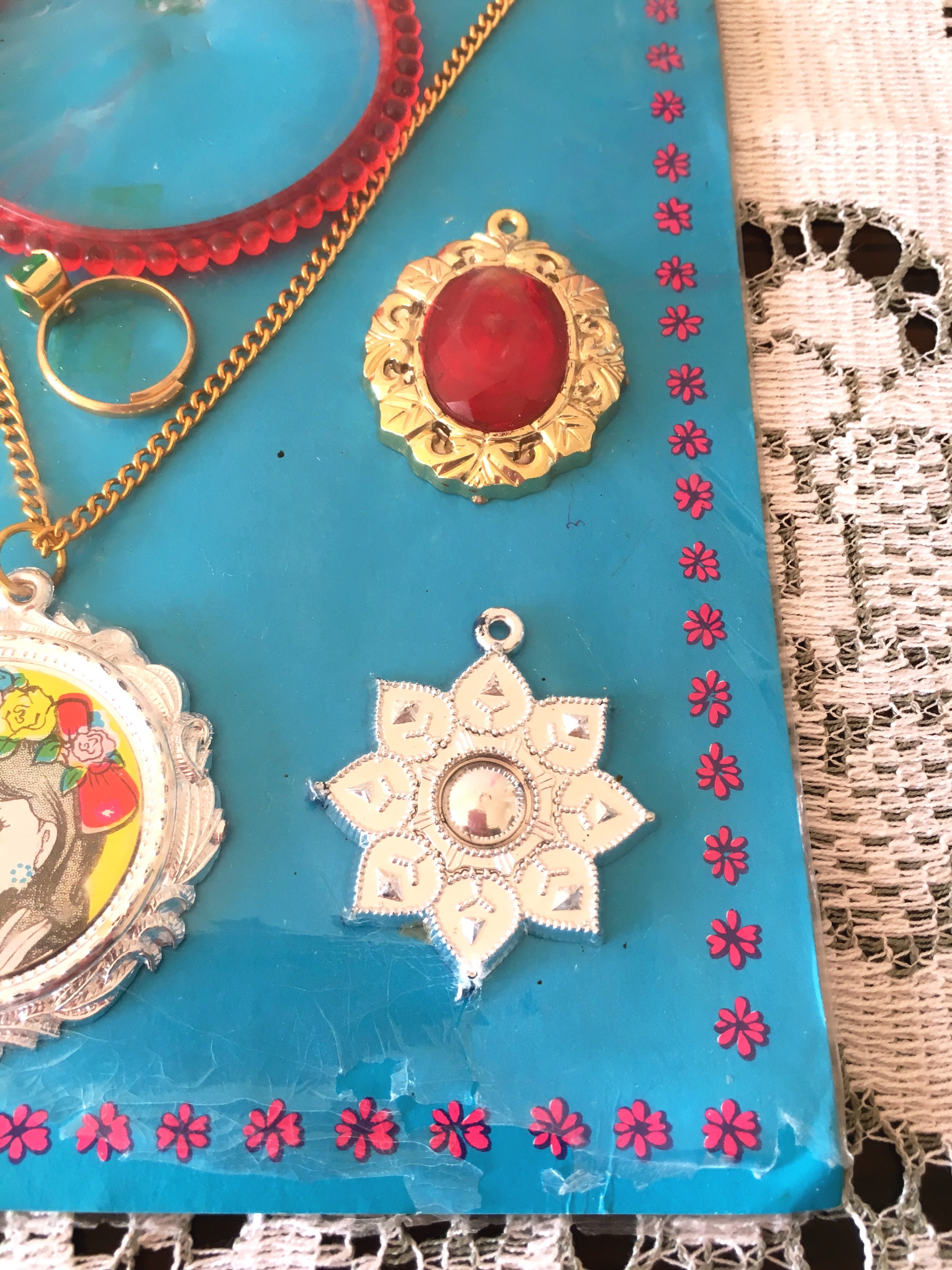 もともとはアクセサリーの全てが台紙に貼られていましたが、テープの劣化の為、ブレスレットと指輪が台紙から取れています。