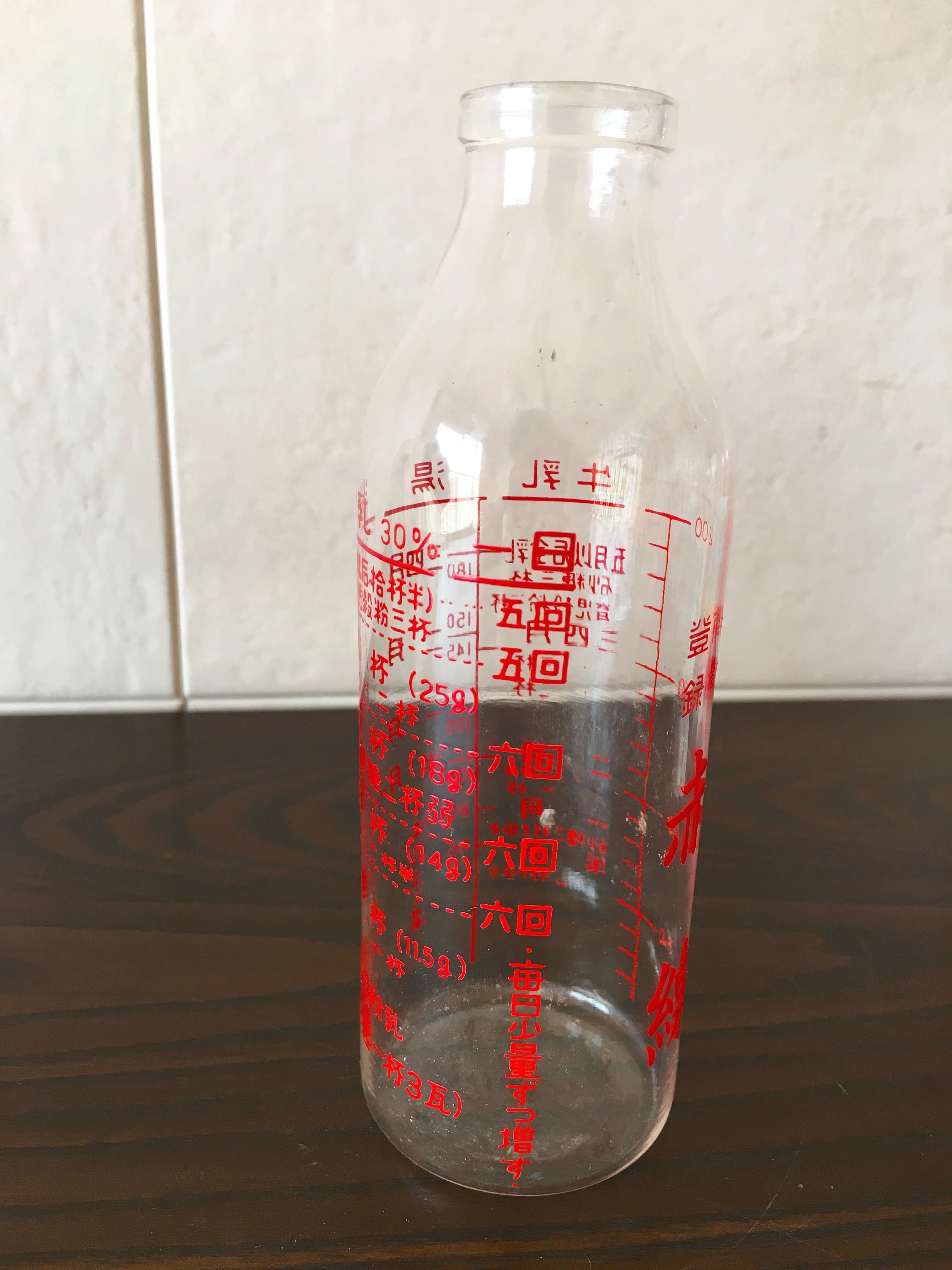 200mlの目盛りの他に牛乳、湯、粉乳の目盛りが記載されています。