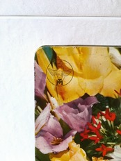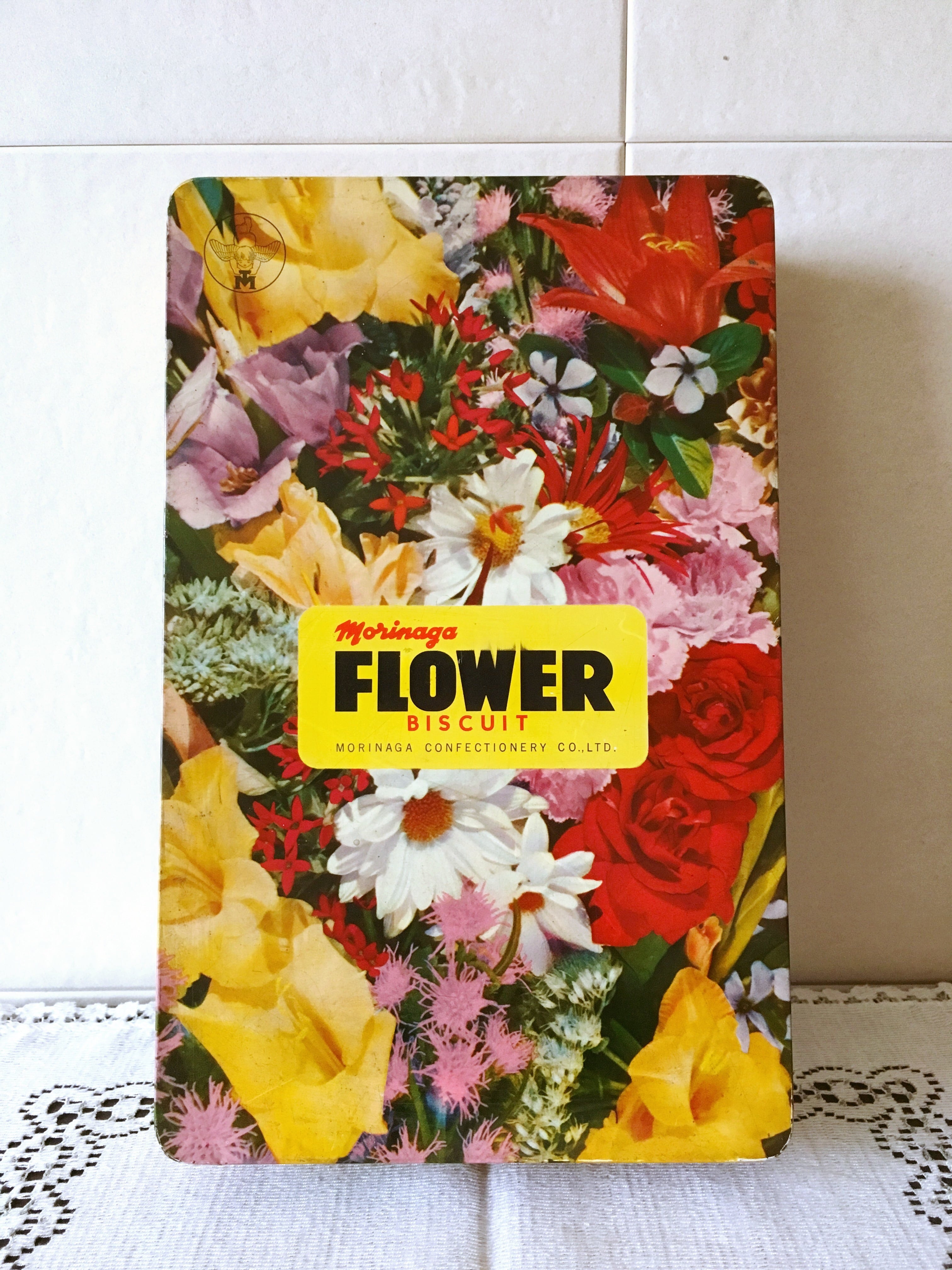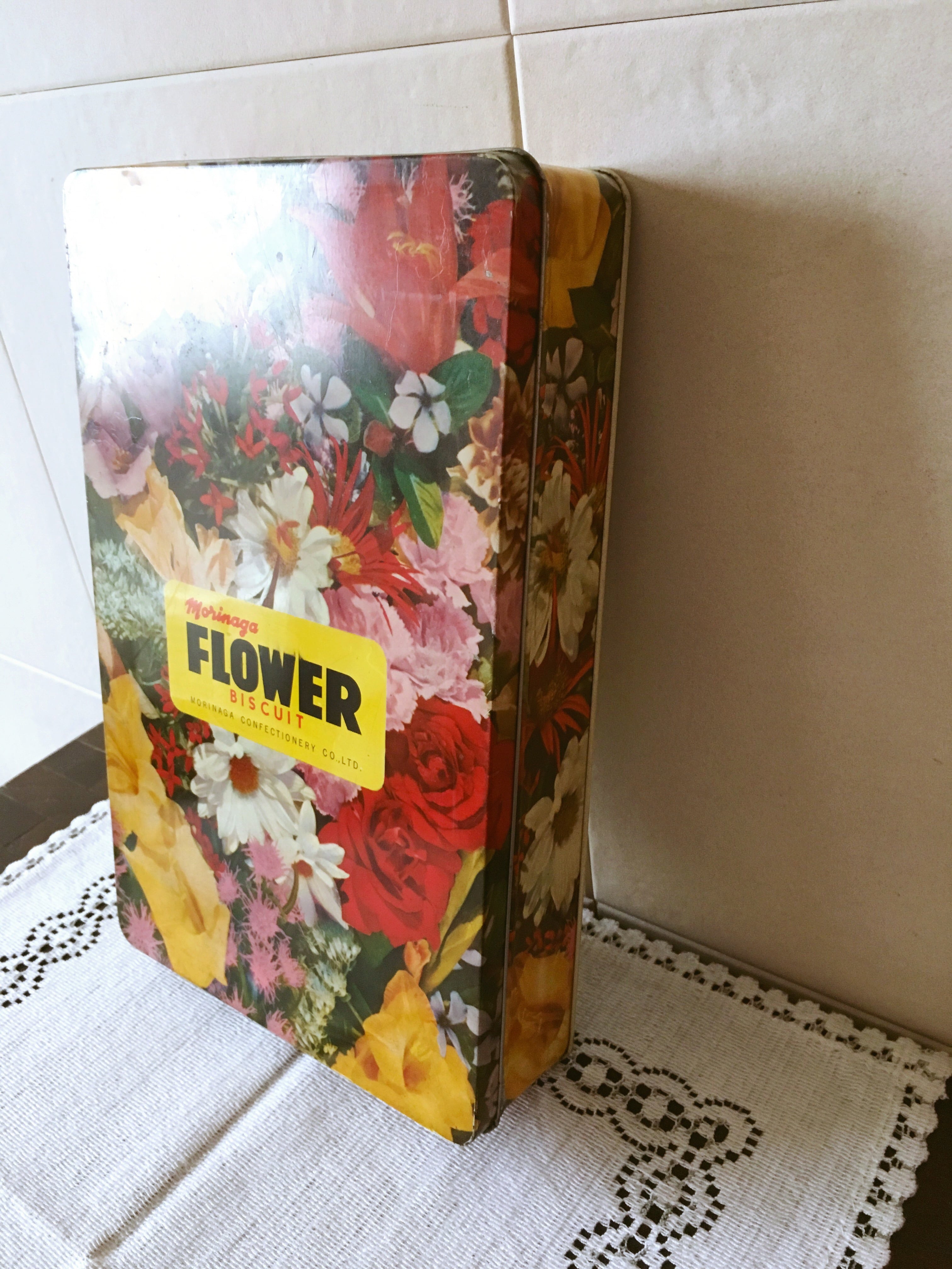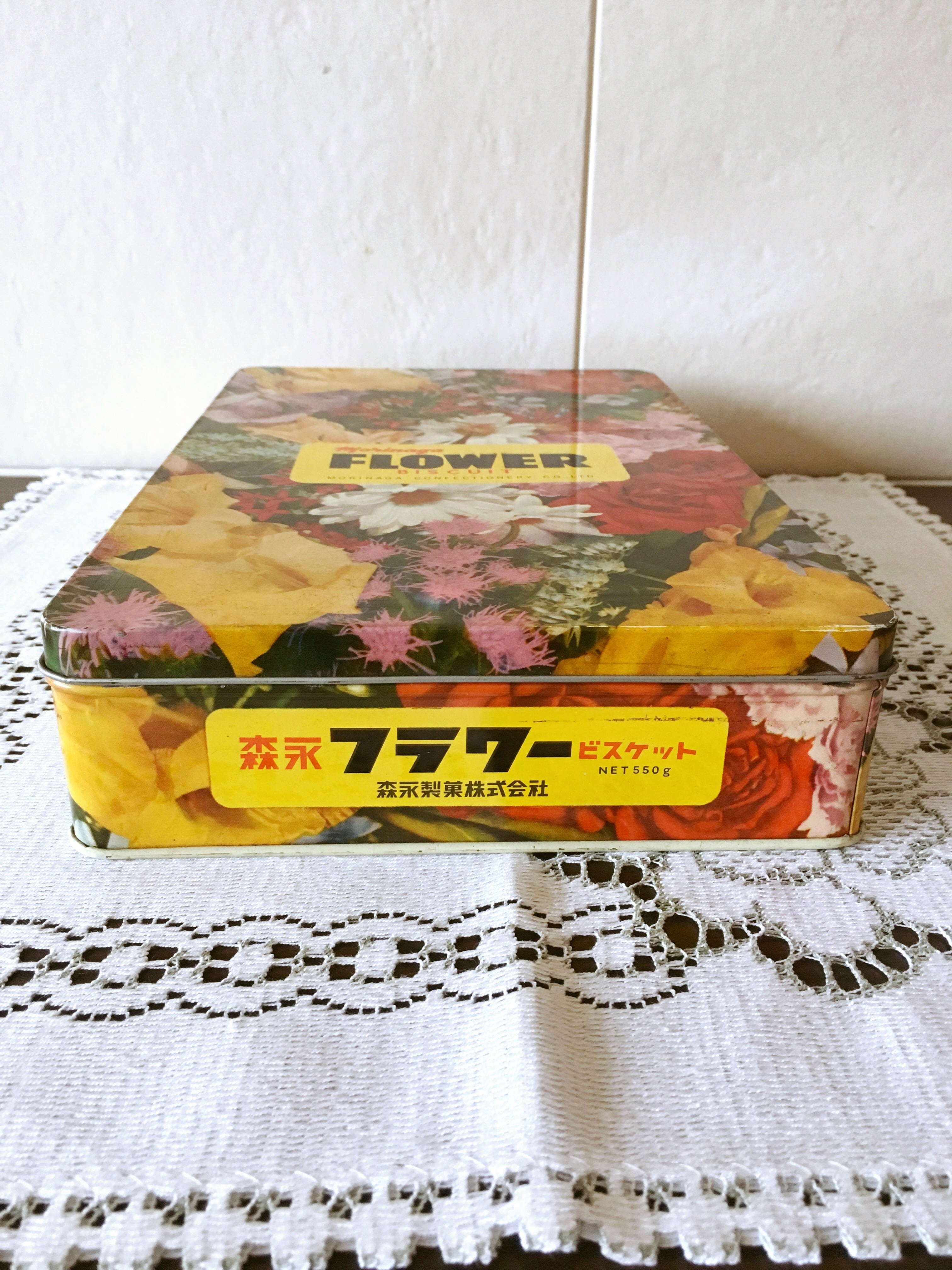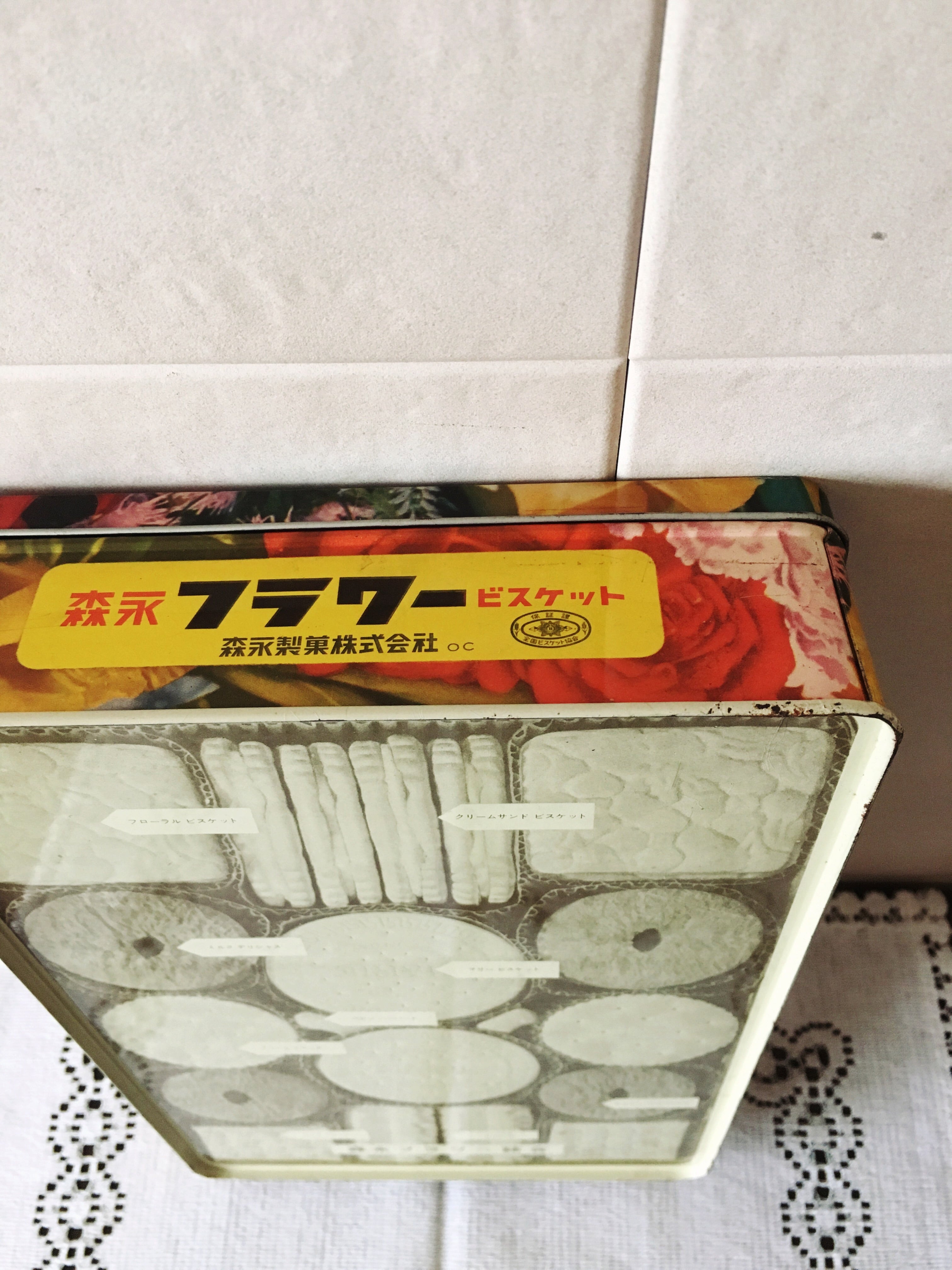 レトロな花柄と左上のエンゼルマークが魅力的な、森永のビスケット缶です。
