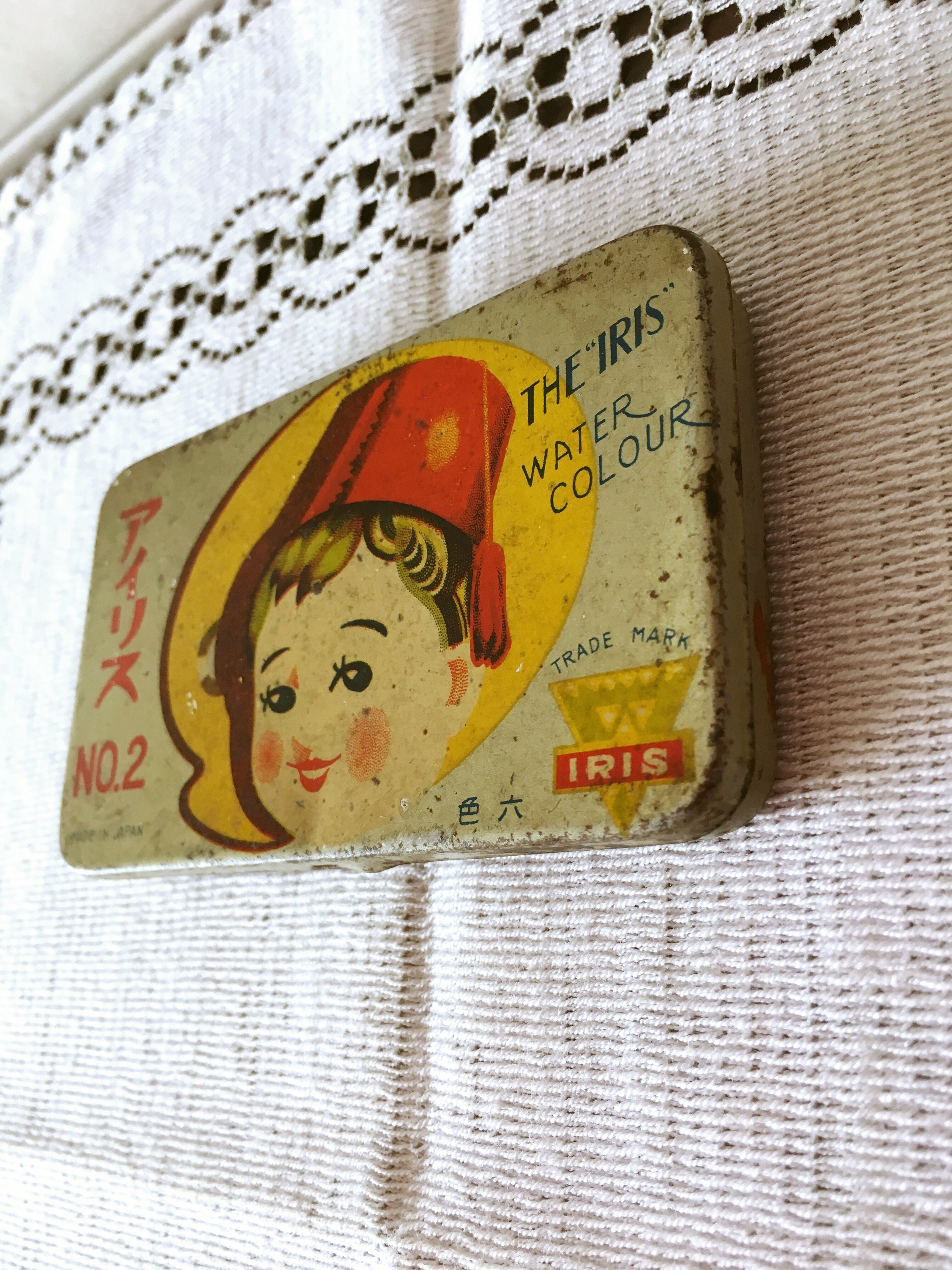 とても可愛い、女の子が描かれた水彩絵の具の缶です。