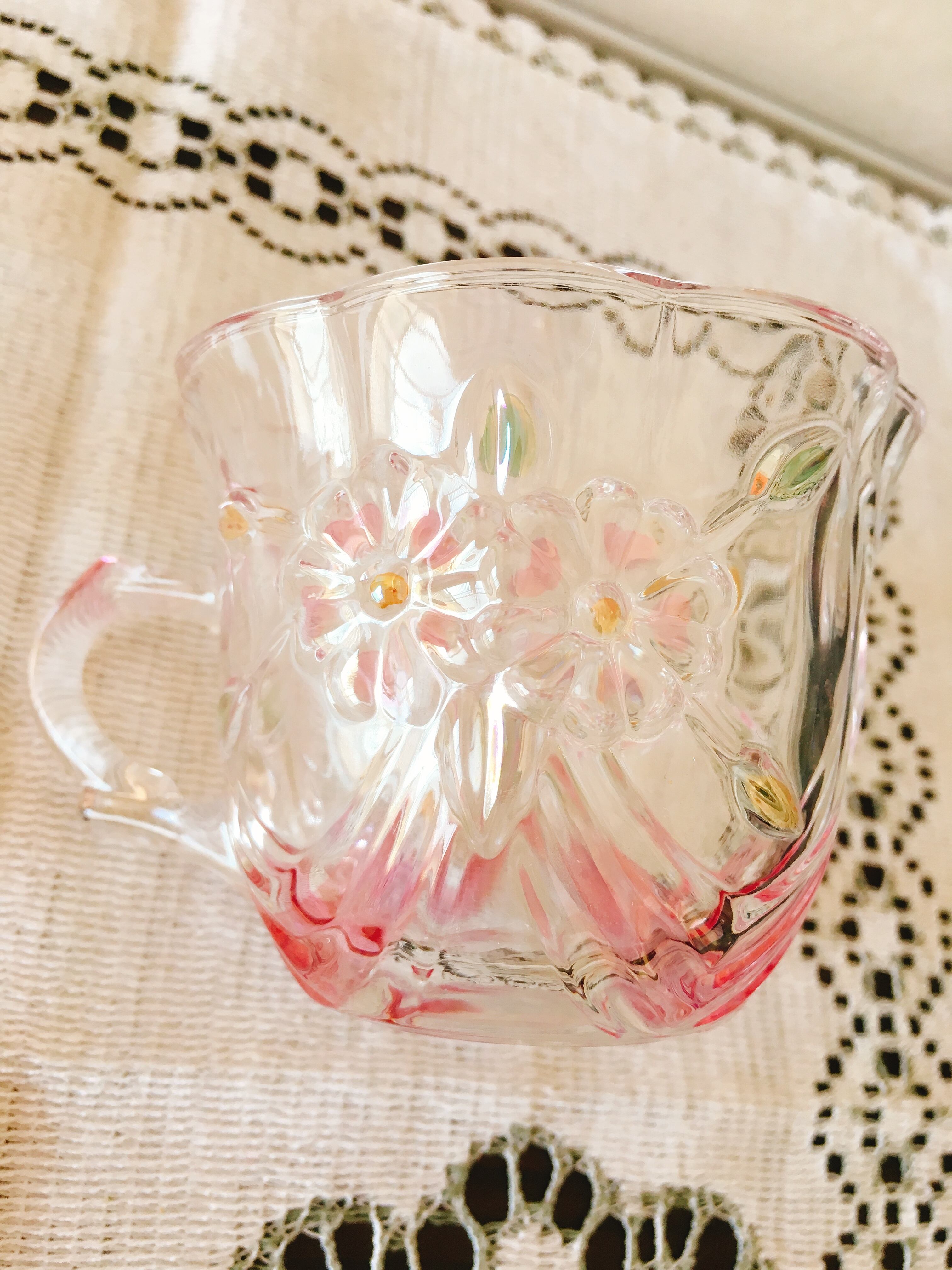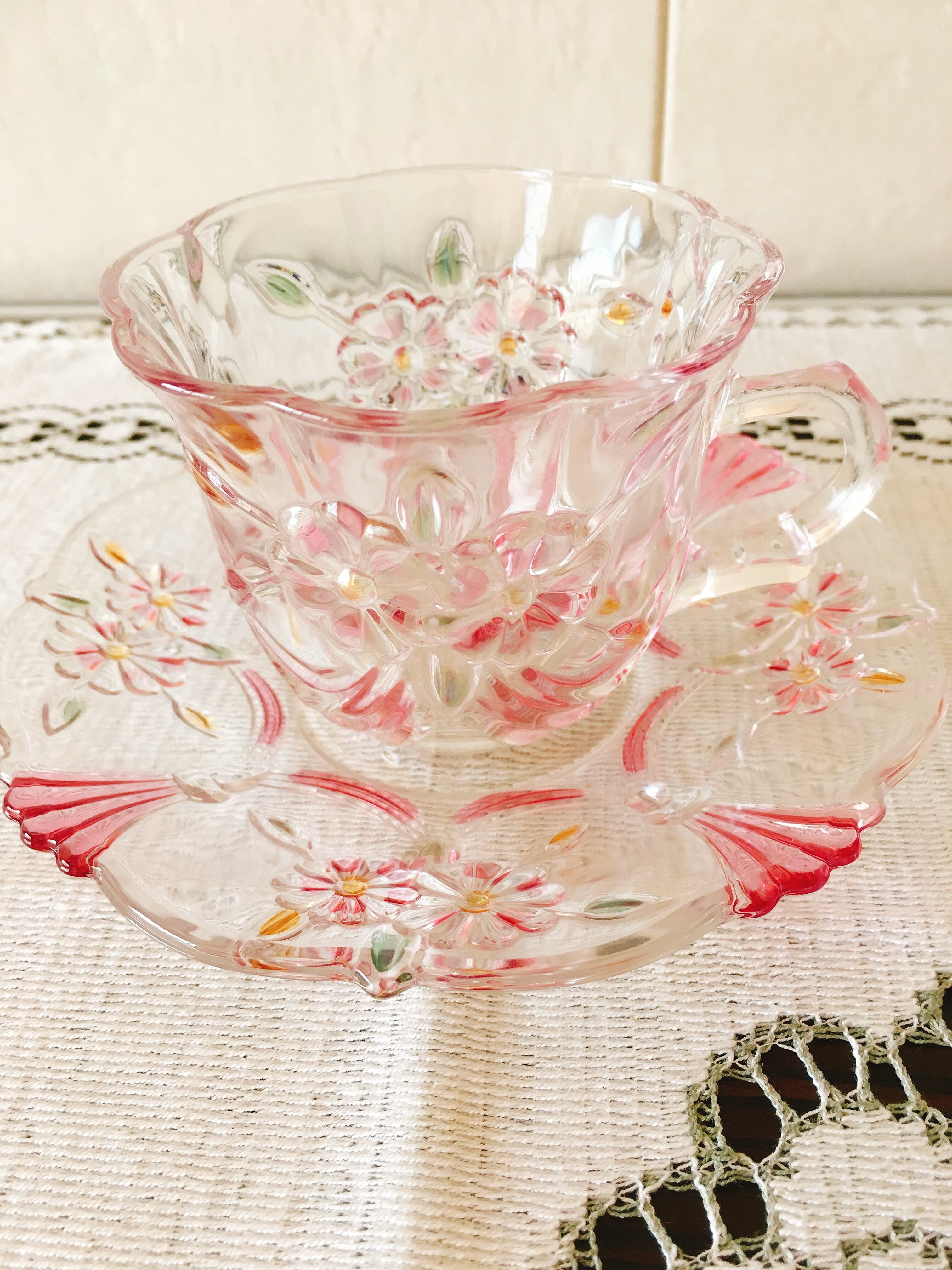 透明ガラスに、ピンクのお花達がとても可愛らしい曽我ガラスのカップ&ソーサーです。
