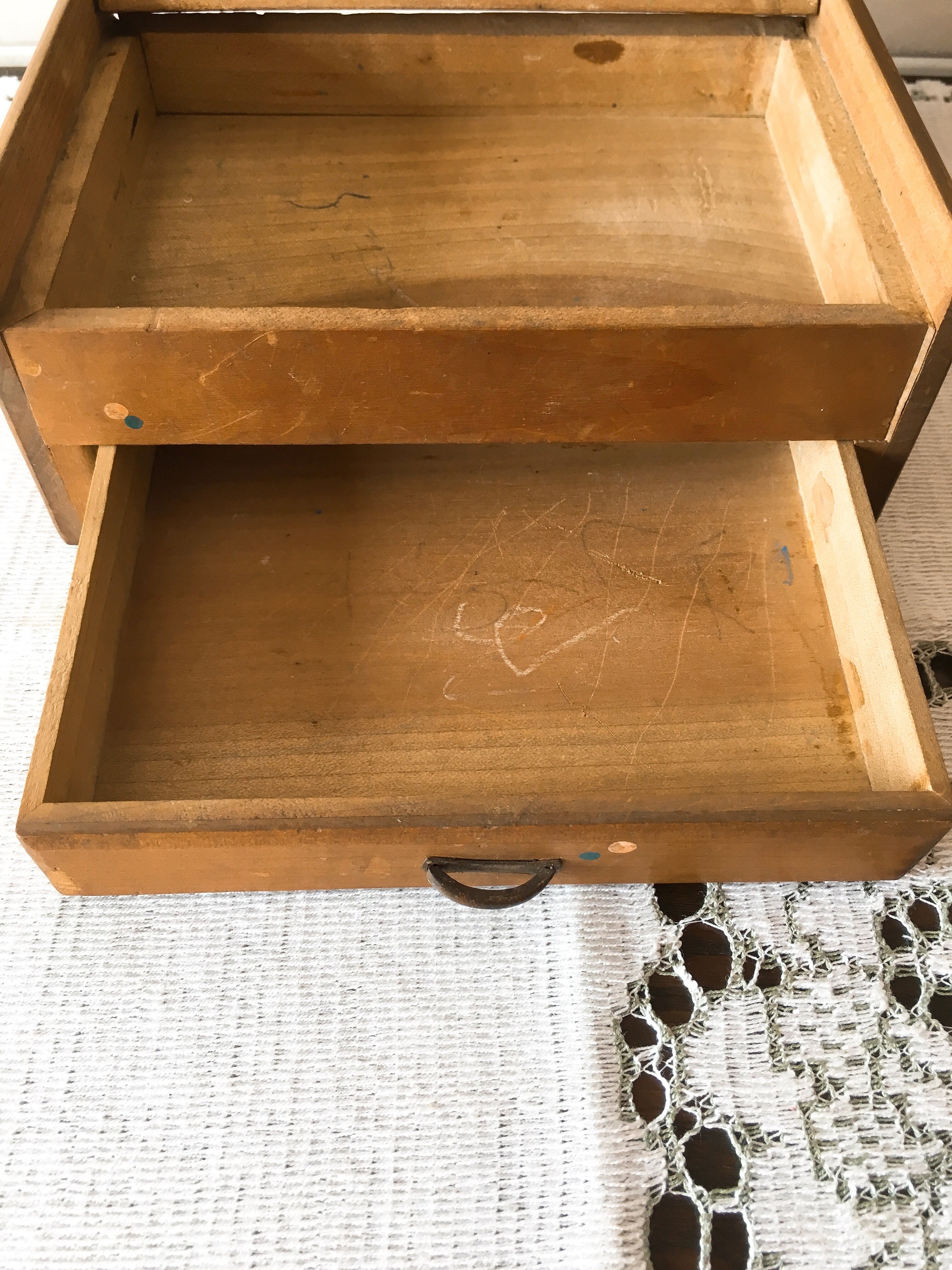 内側には鏡がついていて、宝物のアクセサリーなどを入れて遊んでいたと思われます。