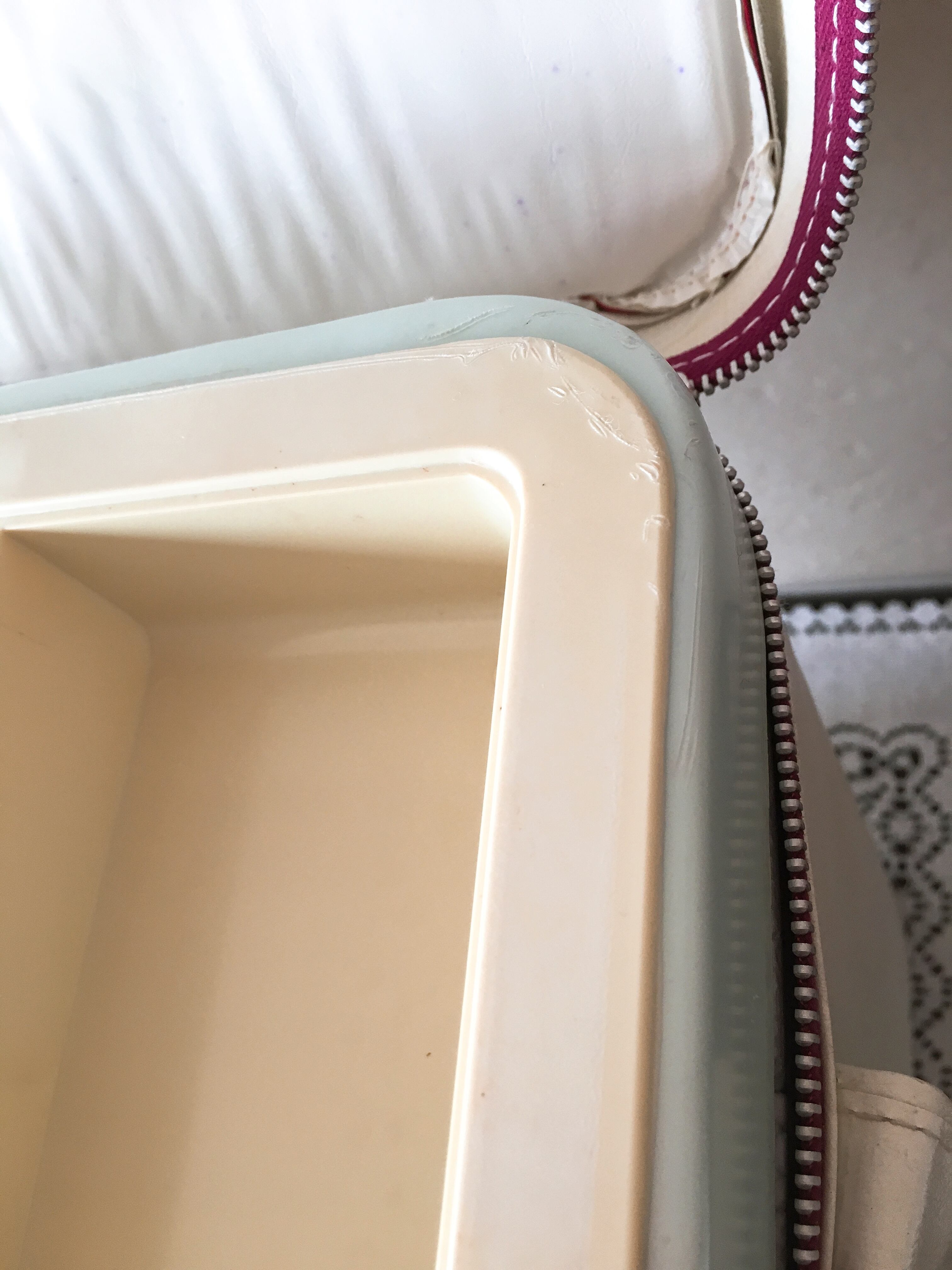 ジッパーがあたる四隅も、ジッパーの赤紫色の擦れがございます。