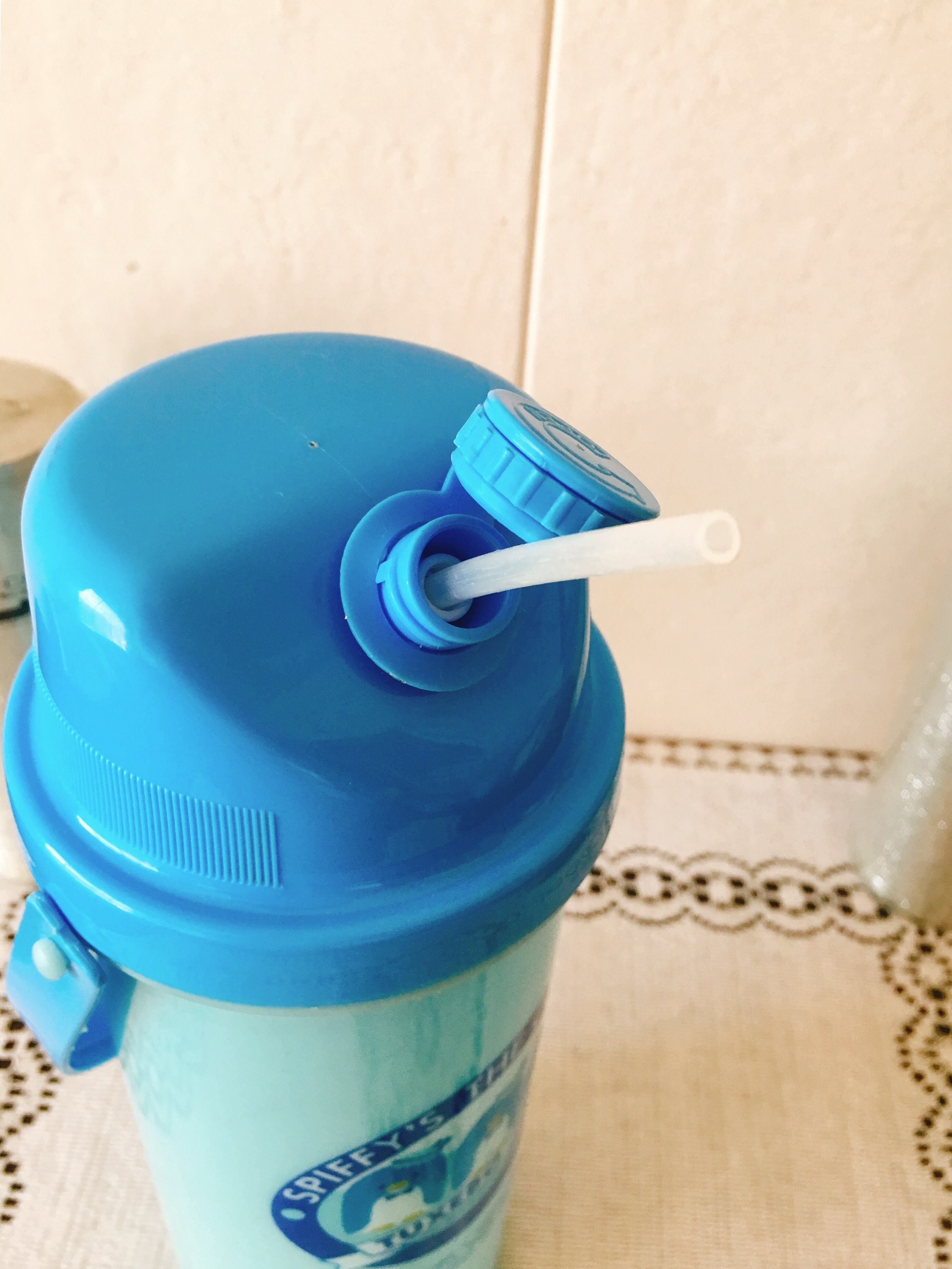 水色が可愛い、タキシードサムのプラスチック製の水筒です。