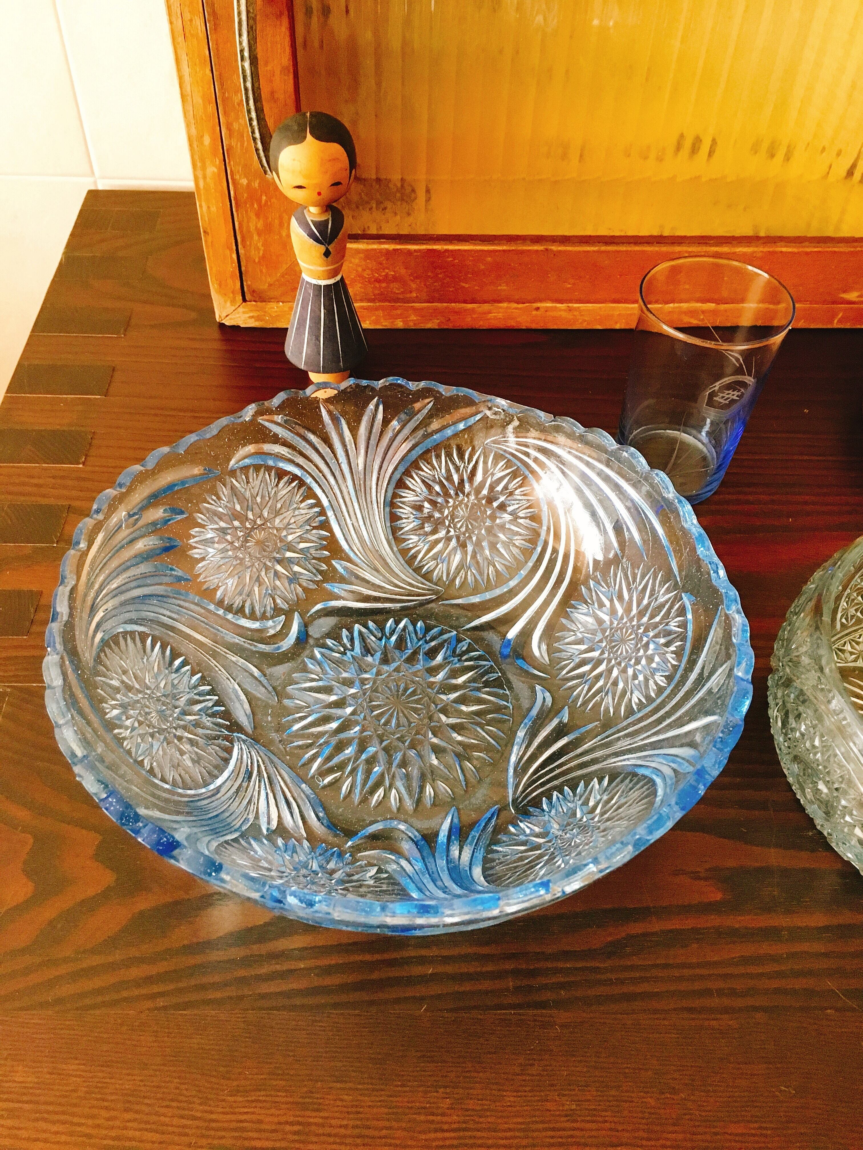 ブルーが美しい、大正期頃のプレスガラスの鉢です。