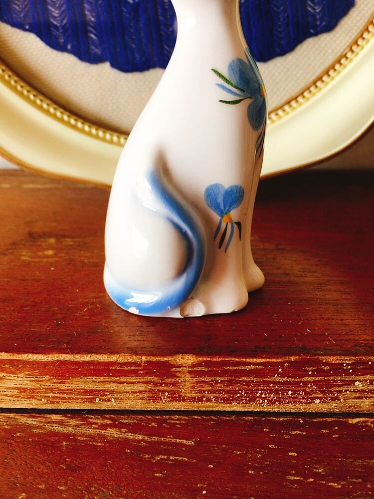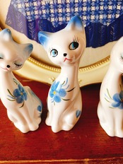 真ん中の猫は、足元右横と尻尾の辺りにカケ、また耳のところに少し塗装の剥がれがございます(画像12〜16枚目)