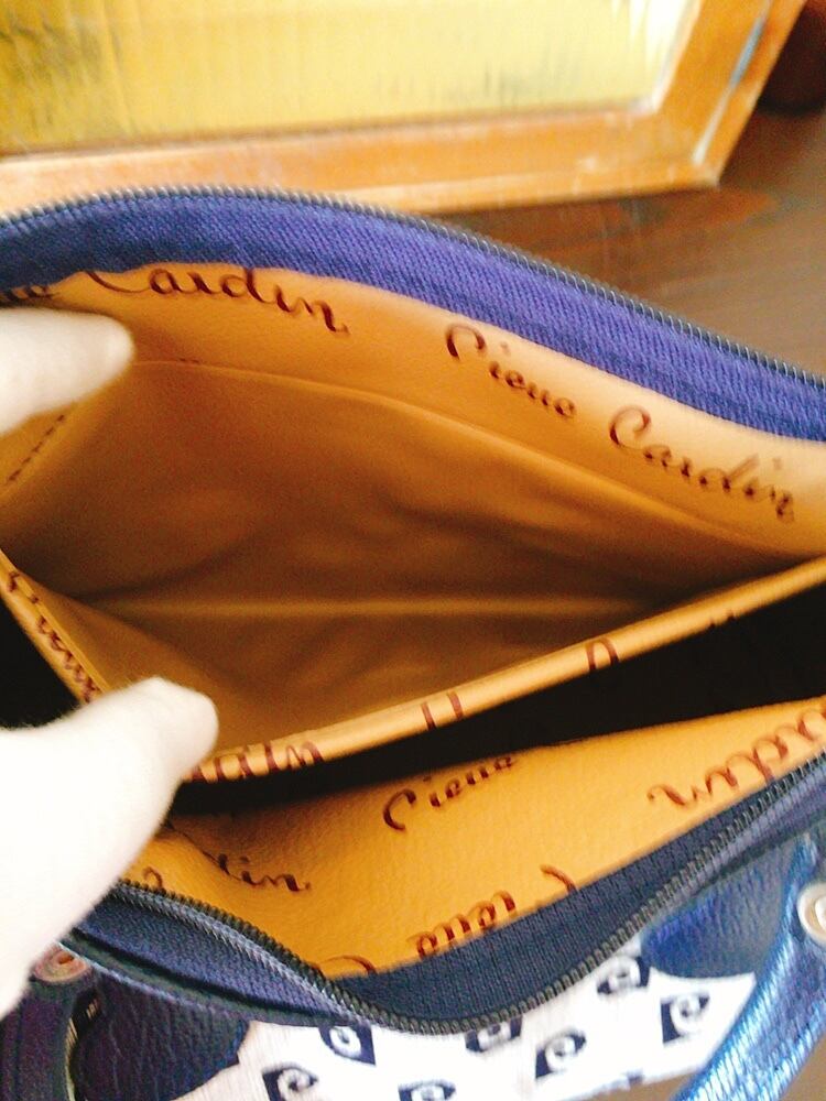 ホワイト寄りのグレーベージュ地に、ネイビーのブランドロゴが配された、ピエールカルダンのミニボストンバッグです。