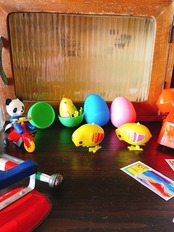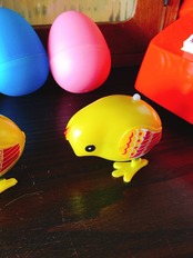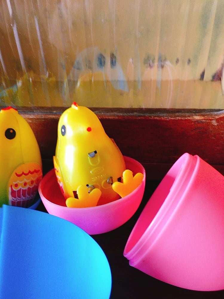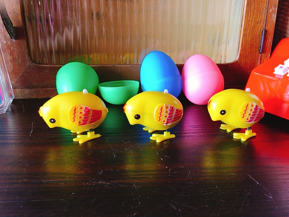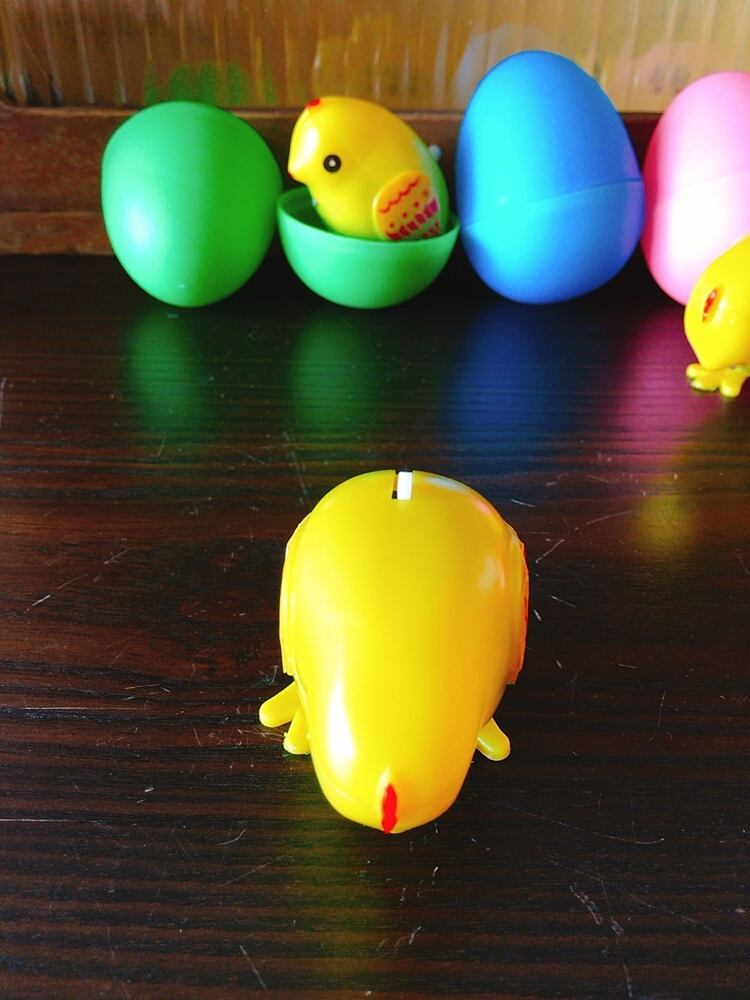 ガチャガチャのような卵型のプラスチックのケースの中に、ひよこが入っています。ひよこは3つとも同じものになります。