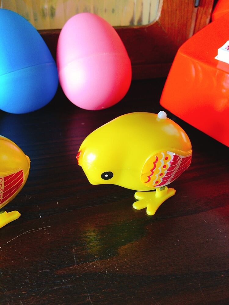 背中にあるレバーを下げて平らなところに置くと、カタカタカタ、と音を鳴らしながらくちばしで地面の餌をついばむような動きが可愛い、HAJI JAPAN製のおもちゃです。