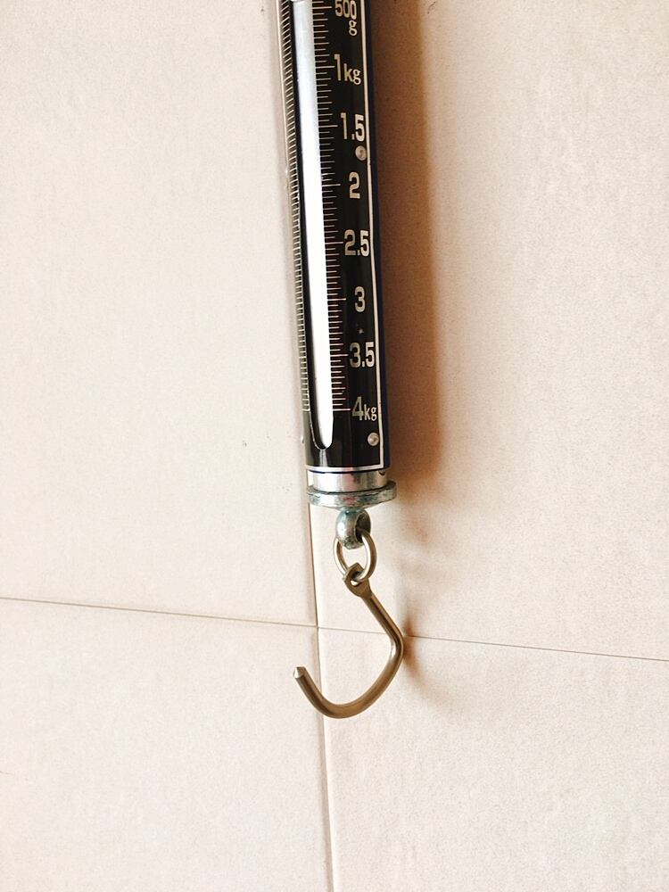 金属製の円柱の形をしており、吊り下げることで重さを量ることができる、バネ式の手はかりです。