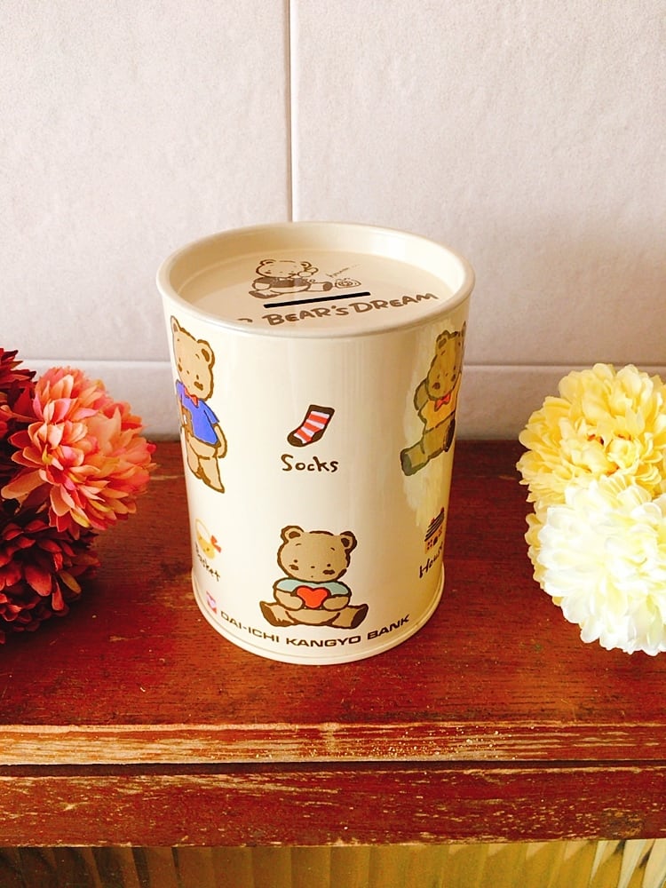 サンリオのクマのぬいぐるみのキャラクター、ミスターベアーズドリームの缶の貯金箱です。