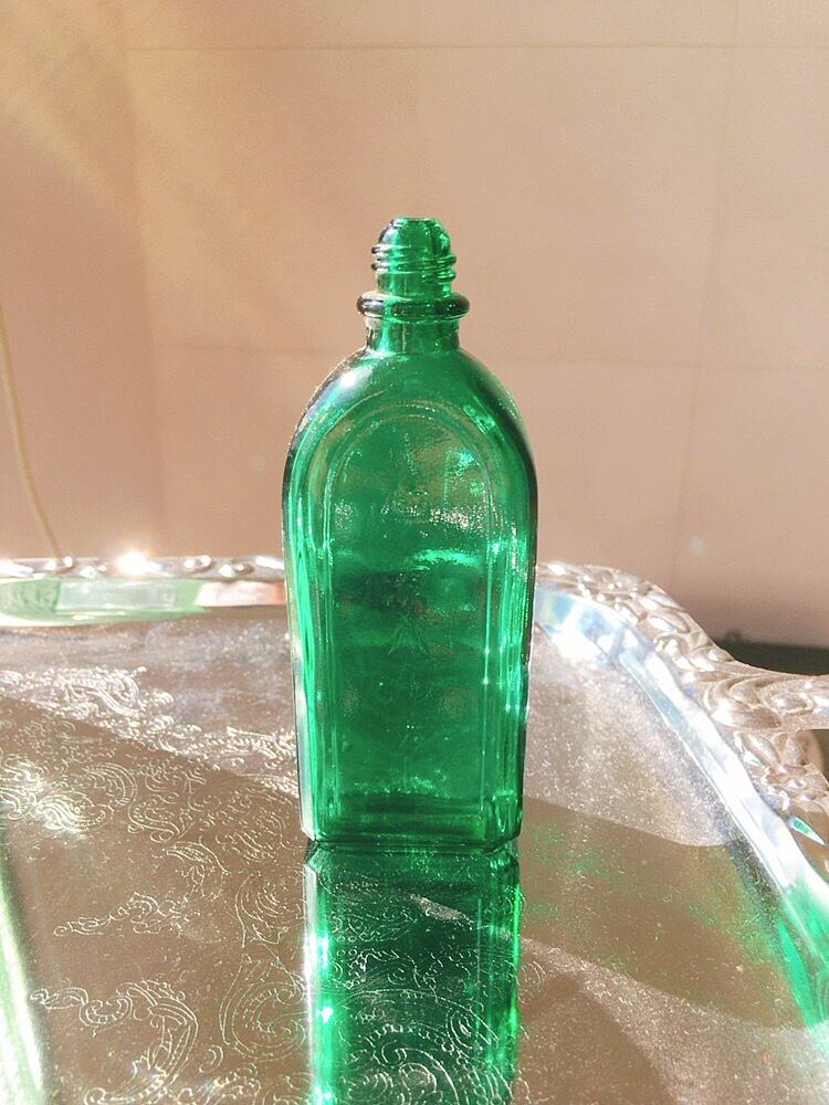 綺麗なグリーンガラスに、「薬液ハルナー」と文字がエンボス加工された瓶です。