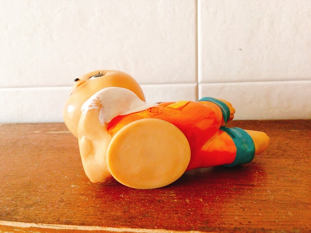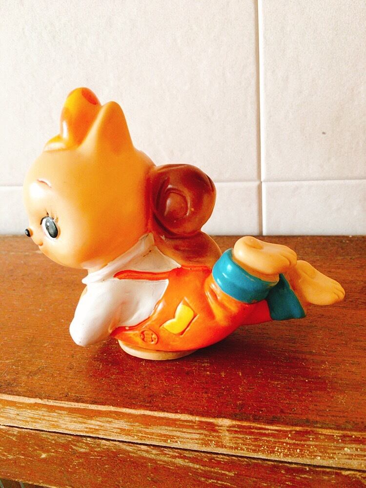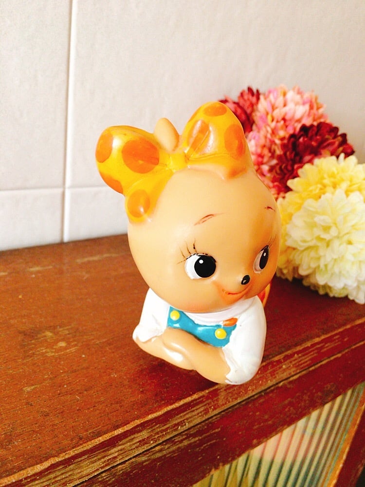昭和の時代、色々な銀行がマスコットキャラクターのソフビ貯金箱をノベルティーとして配布していましたが、こちらのぽっこちゃんのようなポージングは珍しく、とても可愛いです。
