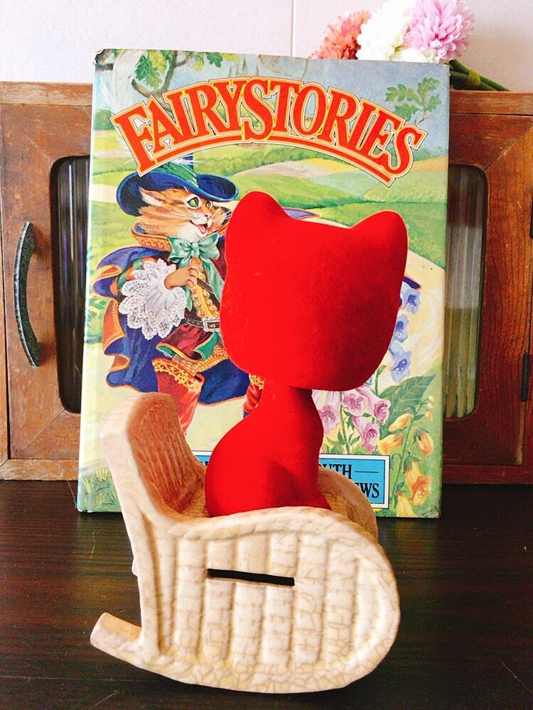首振りタイプの赤い猫ちゃんが、陶器製のロッキングチェアーにちょこんと座ってる姿が可愛い、貯金箱です。