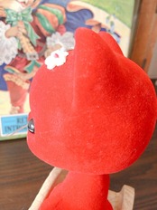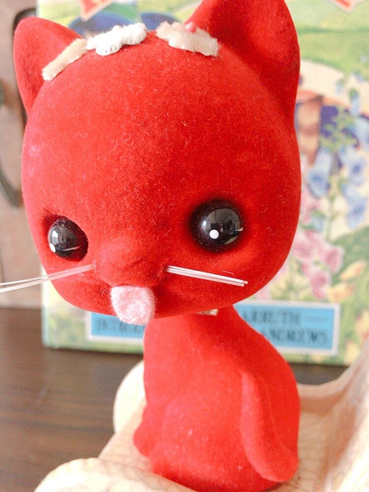 猫ちゃんは全体的に起毛しているフロッキー素材でできています。ところどころ、起毛に乱れ、少し黒ずんでいるところがありますが、当時物としては全体的に状態は良い方です。