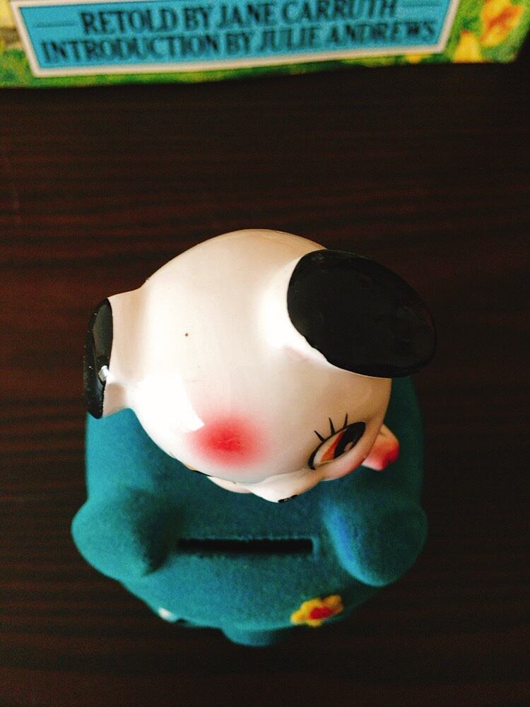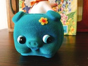 青い豚さんの上に、陶器製のワンちゃんが乗っている、貯金箱です。