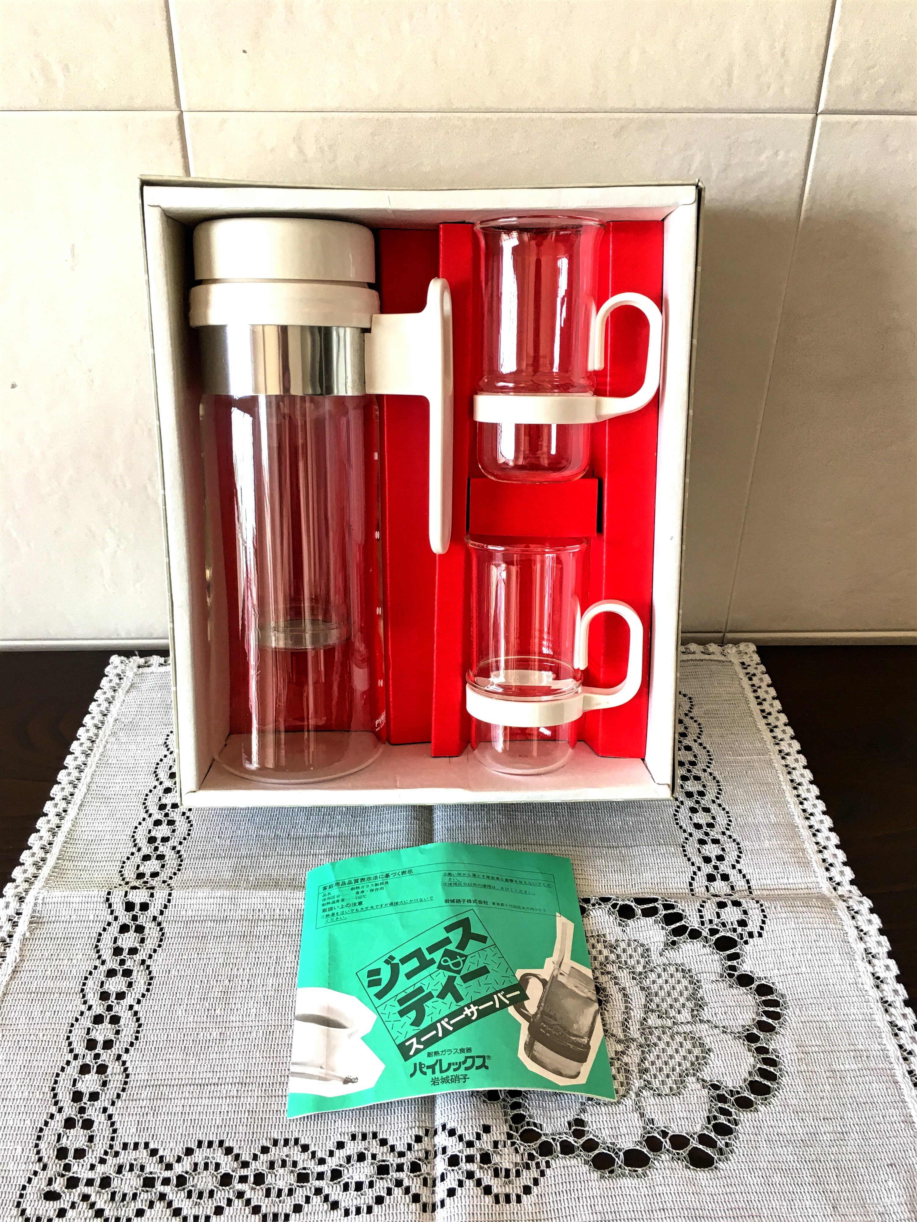 夏はクール、冬はホットの2通りに使用できるパイレックスのセットです。サーバーにはフィルターが付いていて、麦茶や紅茶を入れることができます。プラスチックのデザインが昭和レトロで可愛いです。コップのプラスチック部分に少し赤くなっているところがありますが、未使用なので状態は良好です。ただ、古いものになりますのでその点お含みおき下さい。