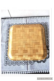 レトロな絵がなんとも昭和感漂うお盆(トレー)です。大きさは25.2×25.2㎝、高さ1.5㎝位です。ほとんど使用傷は見られず、状態は良好だと思いますが、古いものである旨お含みおき下さい。