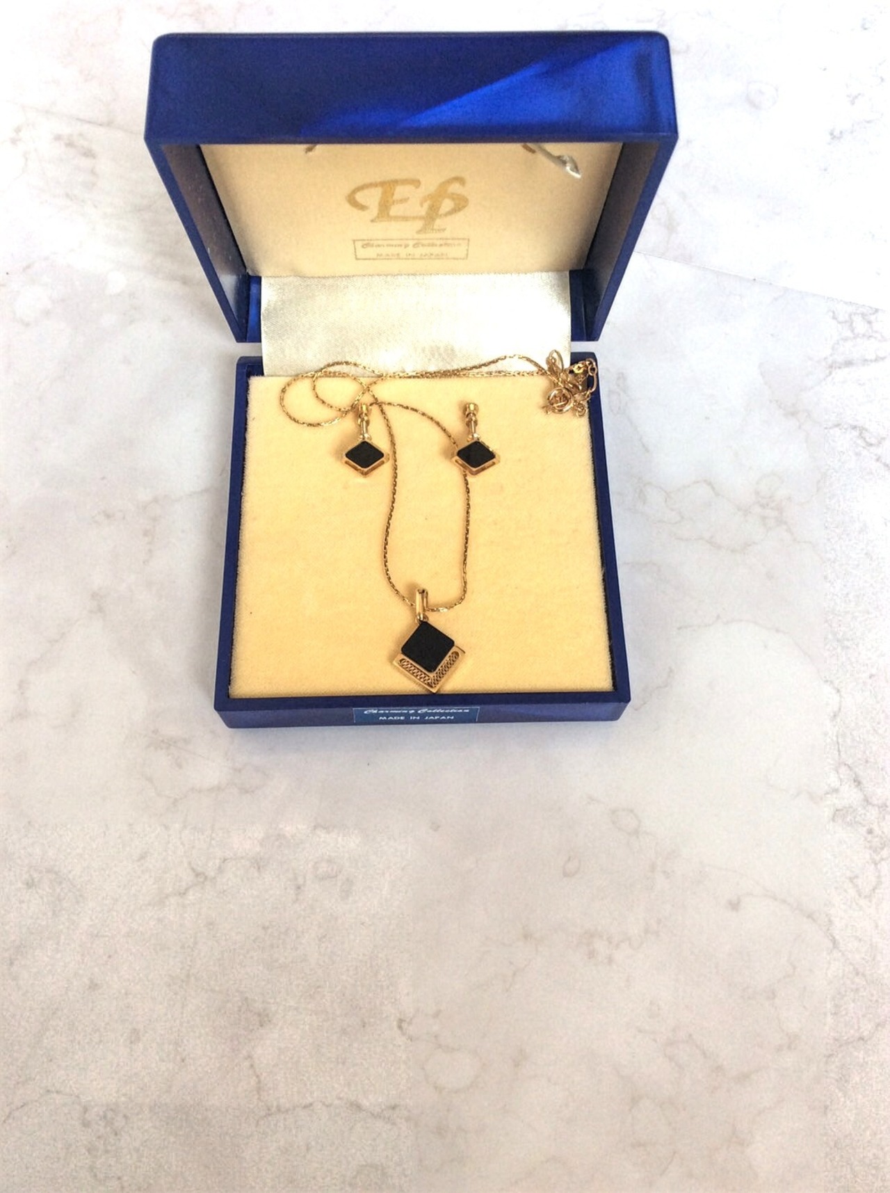 ゴールドにオニキス?の組合せが昭和レトロで可愛いネックレスとイヤリングのセットです。素材は不明です。k18とかではないです。ネックレスの長さは40㎝位、ヘッドの大きさは1.2㎝×1.2㎝位です。イヤリングの大きさは8㎜×8㎜位です。使用感少ないお品ですが、古いものになりますのでその点お含みおき下さい。