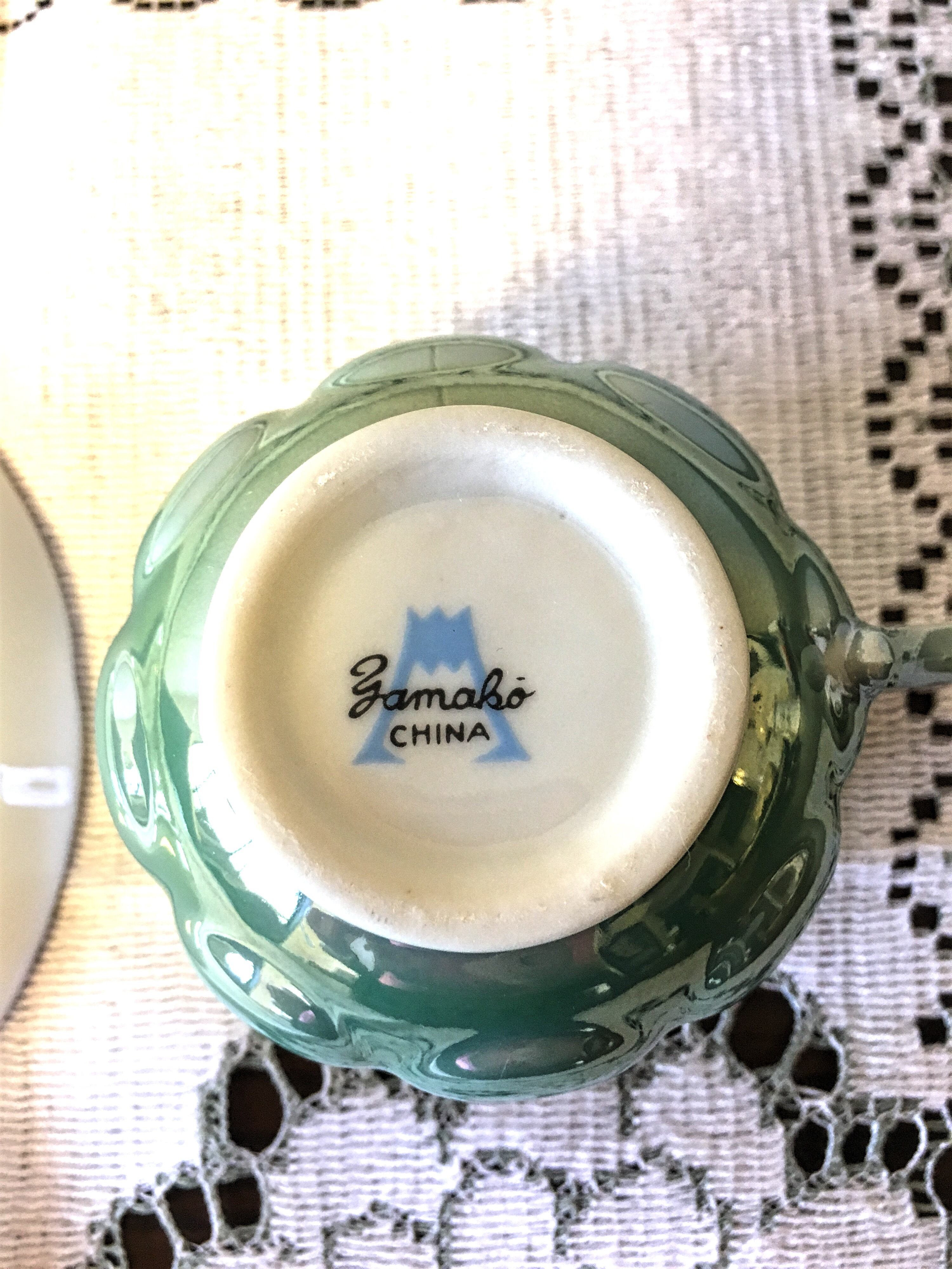 グリーン色のパールラスターがレトロ可愛いカップ&ソーサーです。当時は豪華さが売りだったと思うのですが、今みると逆にチープレトロ感が魅力的に感じてしまいます(^^; 個人的にはバックスタンプの富士山もツボです(๑˃̵ᴗ˂̵)大きさは、ソーサーの直径が13㎝、カップの直径が7㎝、高さ6㎝位です。こちらの品は、もともとの塗りムラがあります。また、ソーサーに少しスレがあります。使い込んだ感じではないです。全部で4客あります。状態の良いものからお出ししていきますので、お早めに!1客のお値段です。