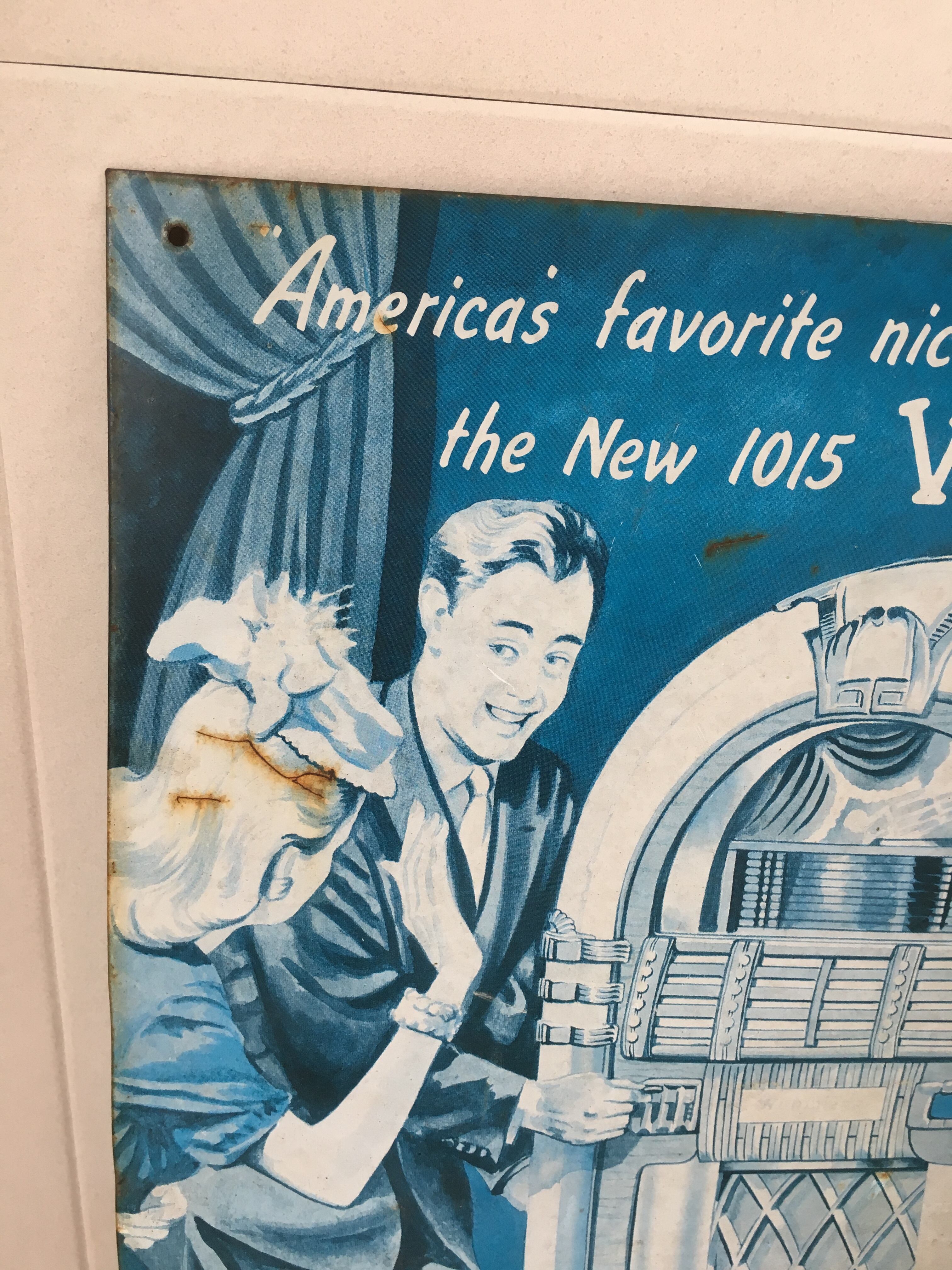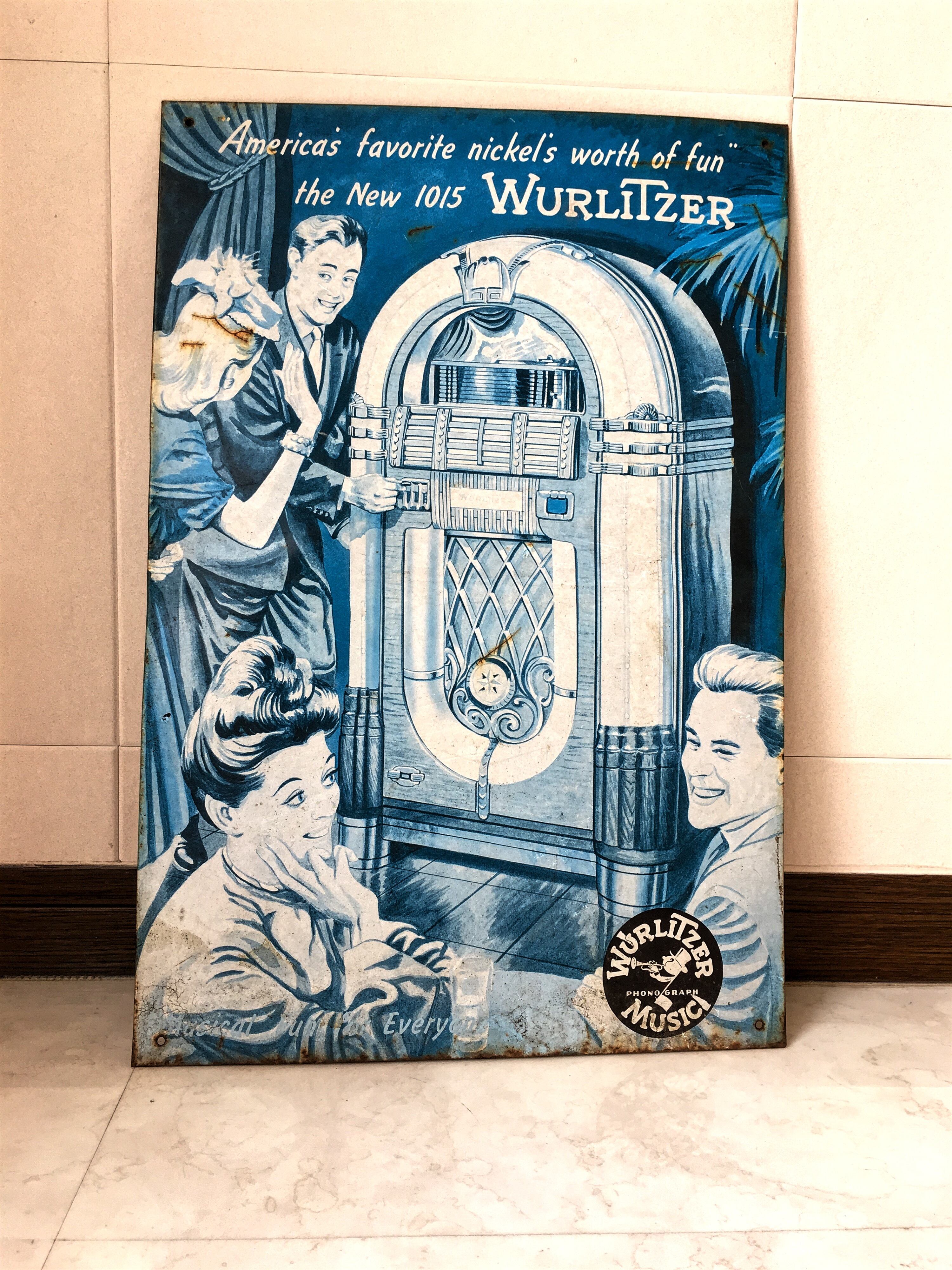 ワーリッツァーのジュークボックス、1015の看板です。アメリカンヴィンテージで素敵ですが、錆び、色褪せ、サイドに少し歪みあり等状態は良くないので、その点お含みおき下さい。大きさは、41.6㎝×28㎝位です。