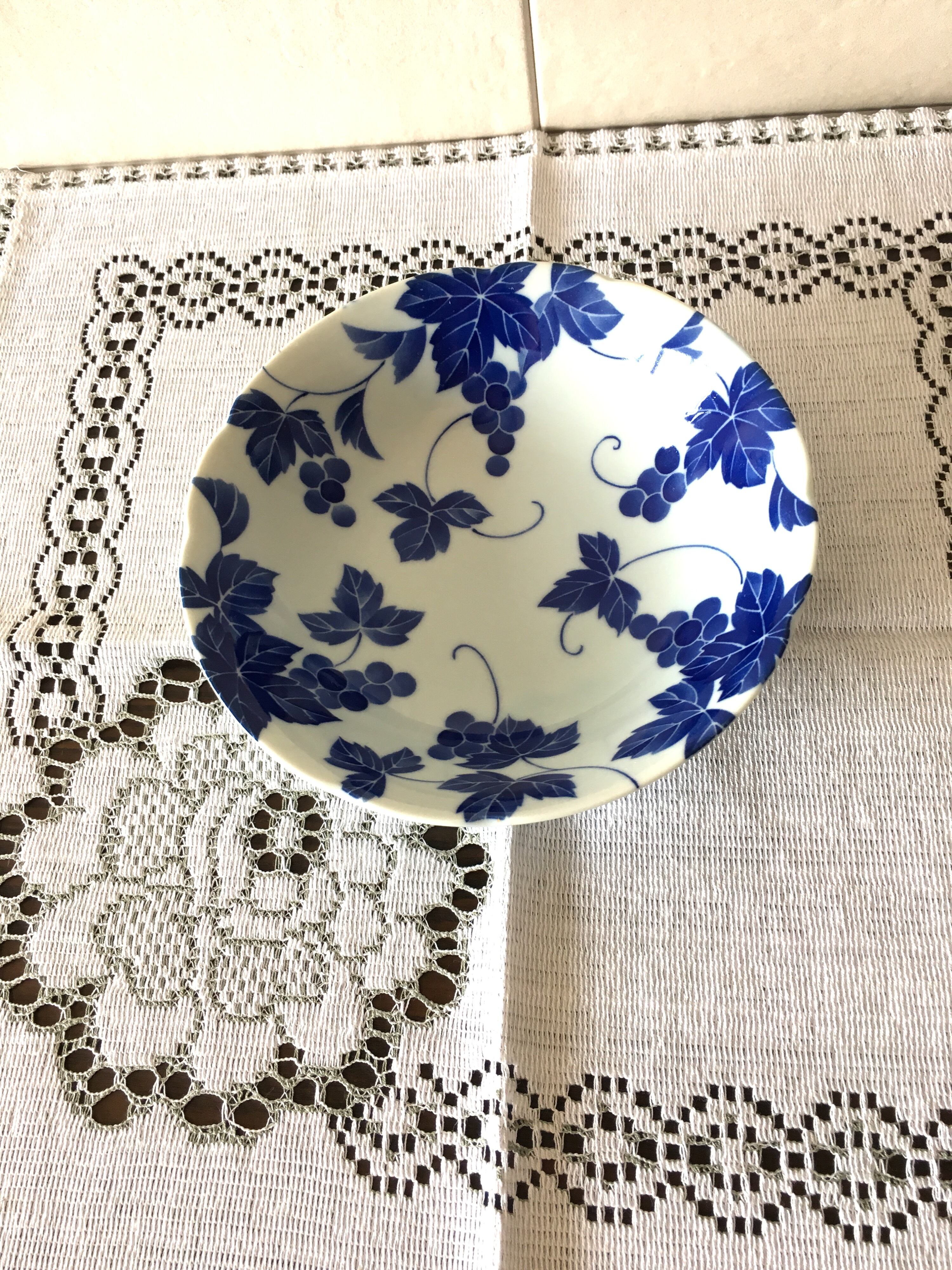 ぶどうがお皿全体に描かれているお皿、5枚セットです。枝豆や冷奴、ヒジキや煮物等、和食に色々似合うお皿です(╹◡╹)。大きさは、直径16.4㎝、高さ4㎝位です。