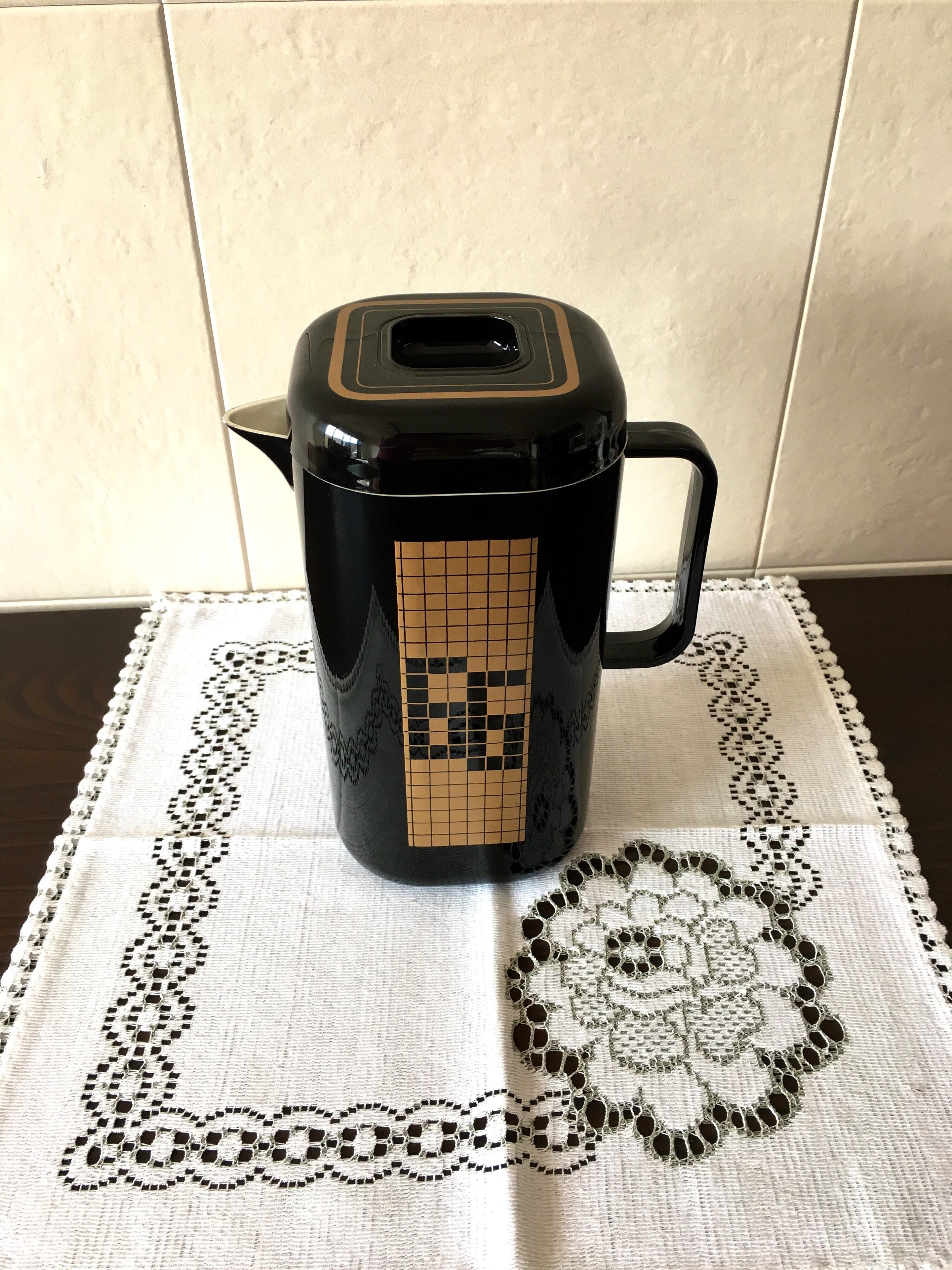 モダンなデザイン、でもレトロチープ感漂う可愛さのウォーターピッチャーです。使用感ないお品ですが、画像3枚目、もともとの塗りムラと、少しクスミがあるのでご確認ください。プラスチック製です。大きさは、11.2×11.2、高さ23㎝位です。黒のピッチャー、珍しいです(╹◡╹)レトロモダンにいかがでしょうか。