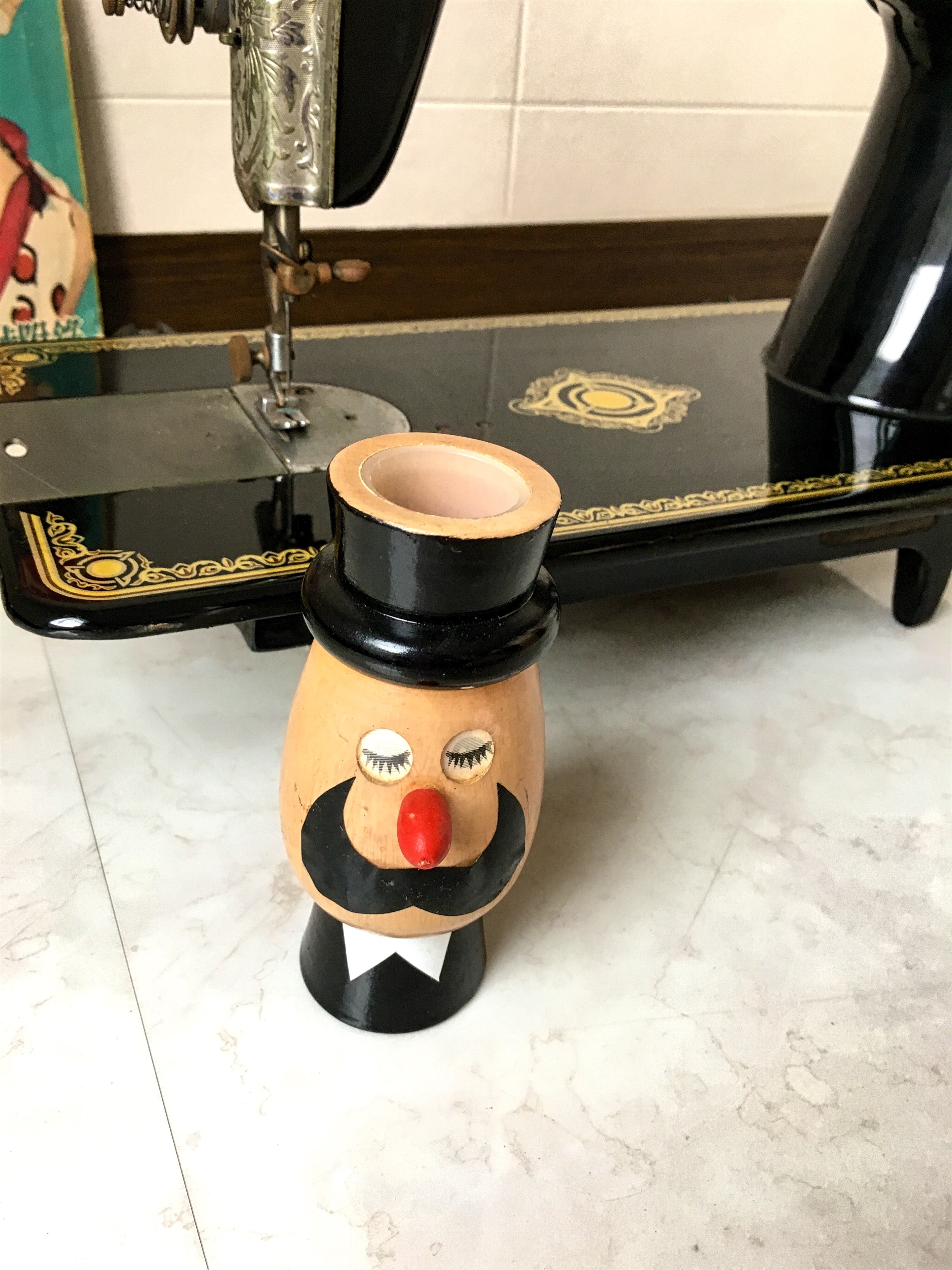 見る角度によって目の表情が変化するのがなんとも可愛い木のオブジェです。頭の部分が筒状になっているので、楊枝やストローを入れるものかもしれません。ヒゲ部分はシールになっています。少し汚れ、ハット等にハゲがあります。古いものとしてご理解のほどお願い申し上げます。大きさは、直径4㎝、高さ11.2㎝位です。