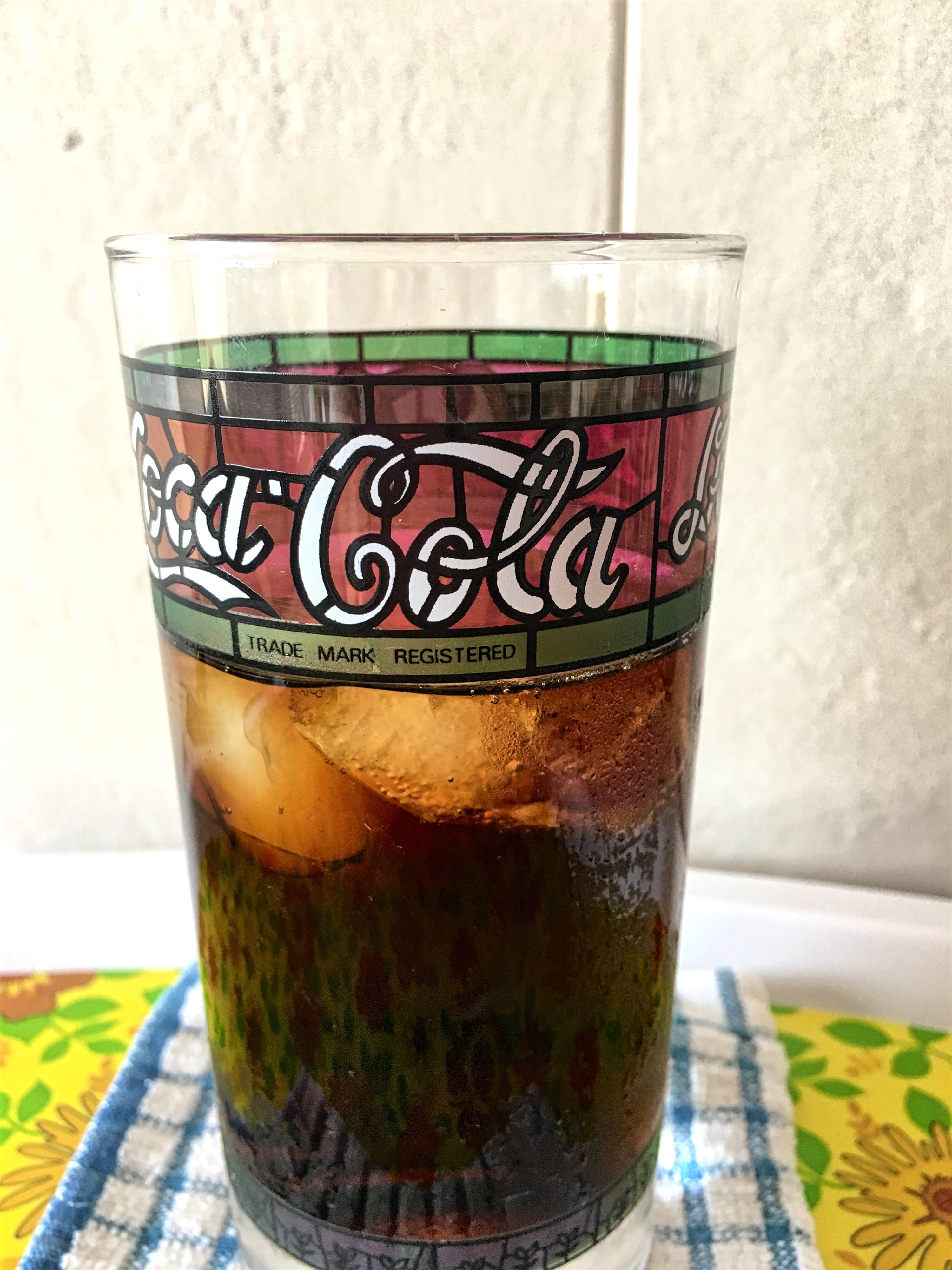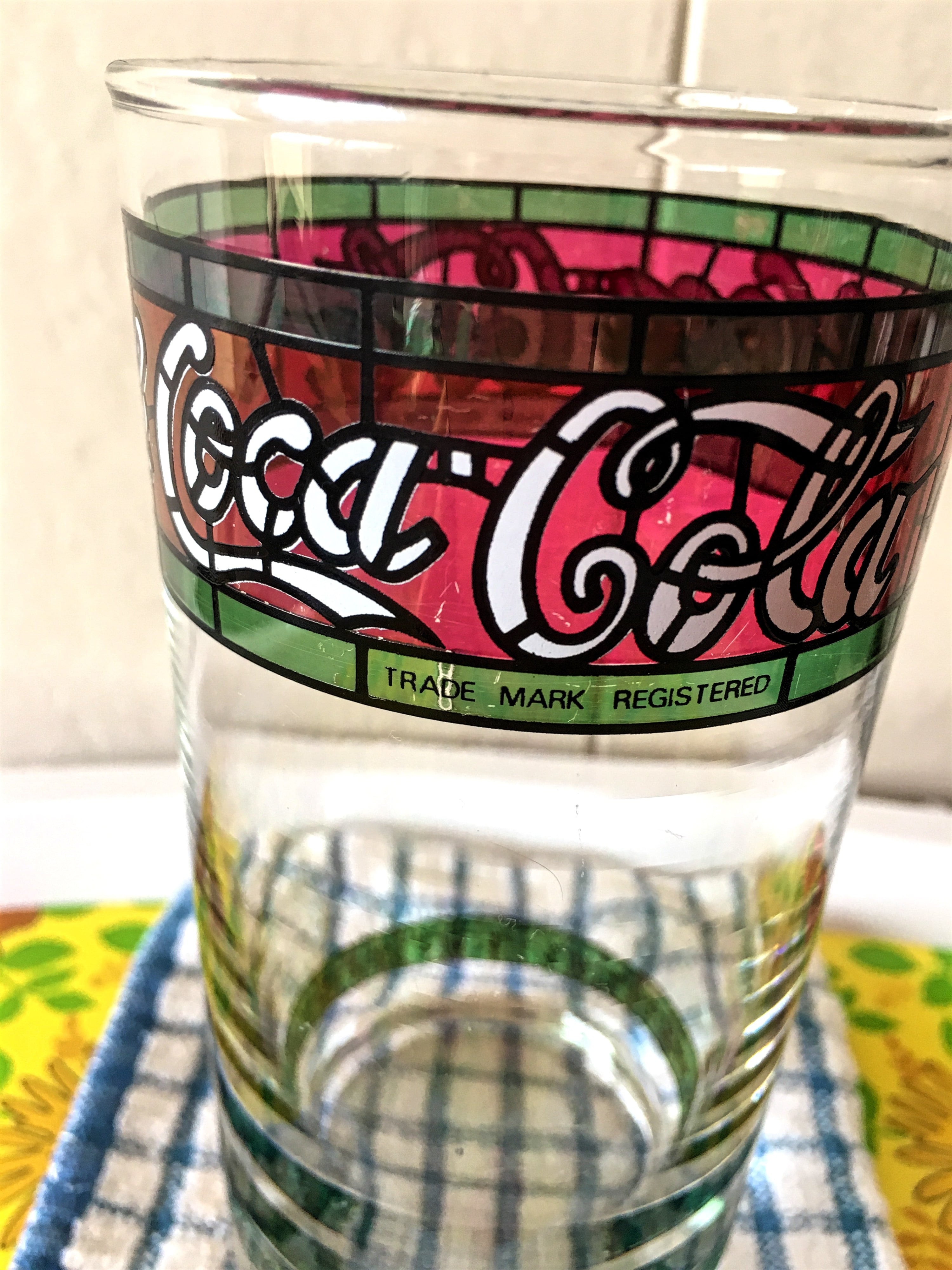 コカコーラのティファニーステンドグラス柄のコップです。グラス下部分にもグリーンの葉のステンドグラス柄が描かれ、とても素敵です。それぞれ柄部分にスレがありますので、古物にご理解いただきますよう、お願い申し上げます。大きさは直径6㎝、高さ13.8㎝位です。1個のお値段です。