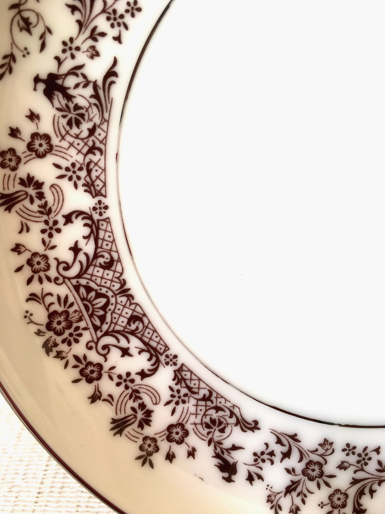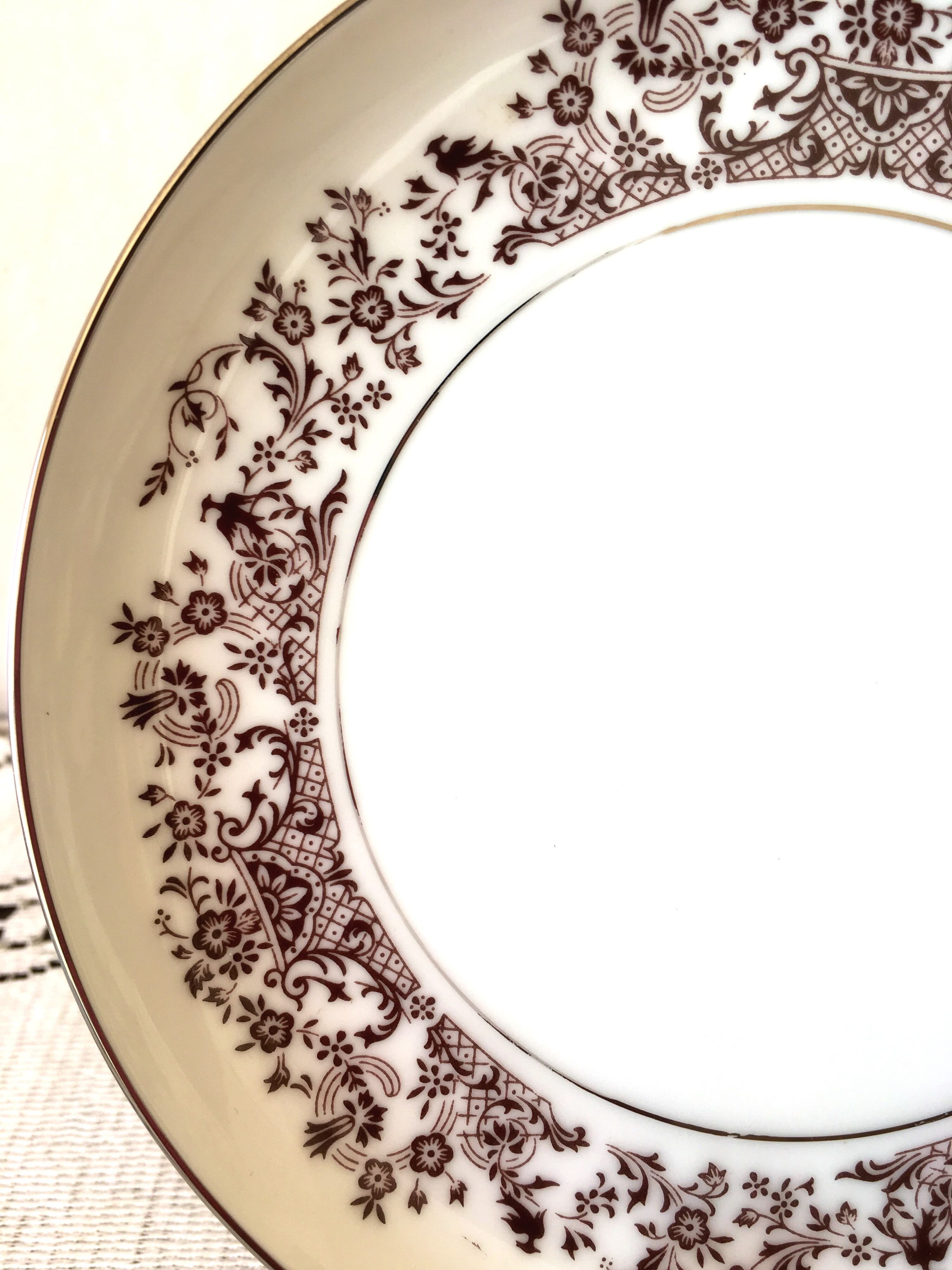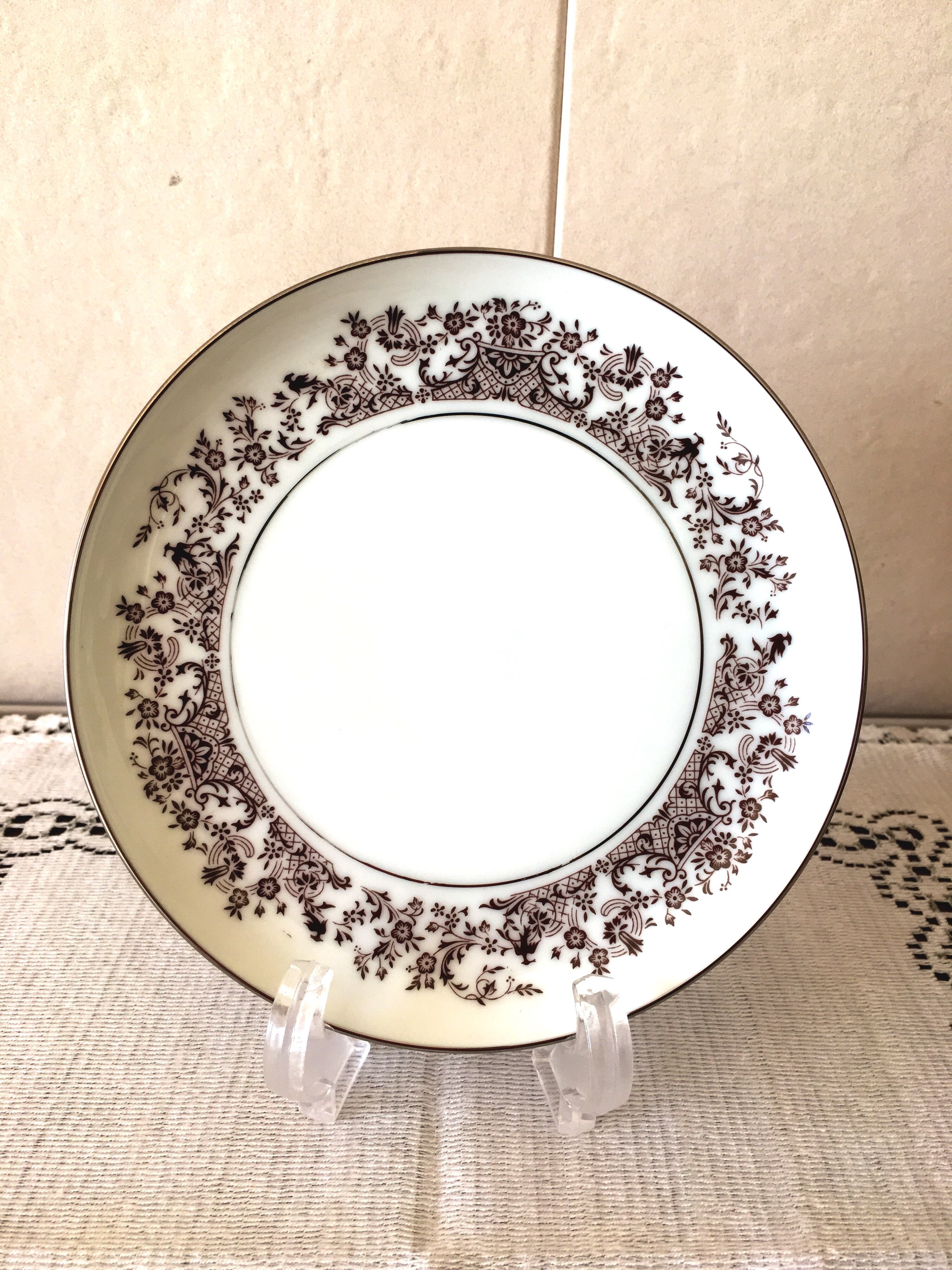 白地にシルバーのライン、ブラウンの細かい花鳥の文様が素敵なオールドノリタケのディナーセットです。