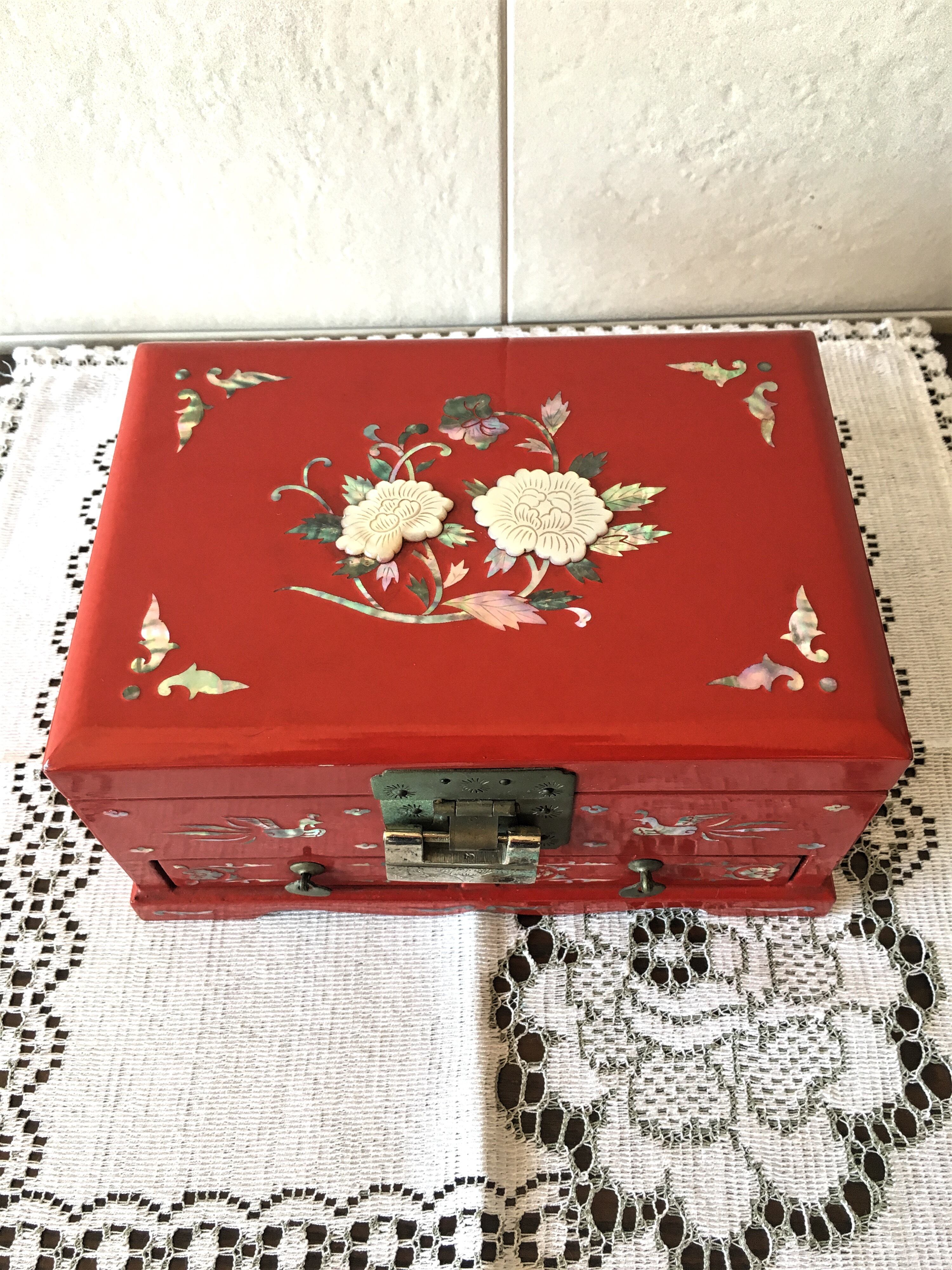 赤の漆塗りに螺鈿細工が施された素敵な小物入れです。オルゴールが付いているのですが残念ながら音が出ません。大きさは、奥行き13.6㎝、幅20㎝、高さ10㎝位です。ところどころ、木の部分が見えているところがあります。使用や見た目に大きなダメージというほどではありませんが、古いものとしてご理解のほどよろしくお願い申し上げます。鍵付きです。