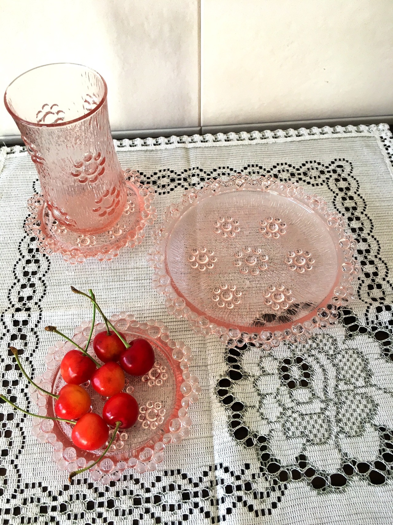 アデリアの人気シリーズ、ピコットです。ピンク色のグラスにつぶつぶのお花、草のような縦のラインが可愛らしいお品です。直径6.2㎝、高さ12㎝位です。在庫3個ございます。1個のお値段です。