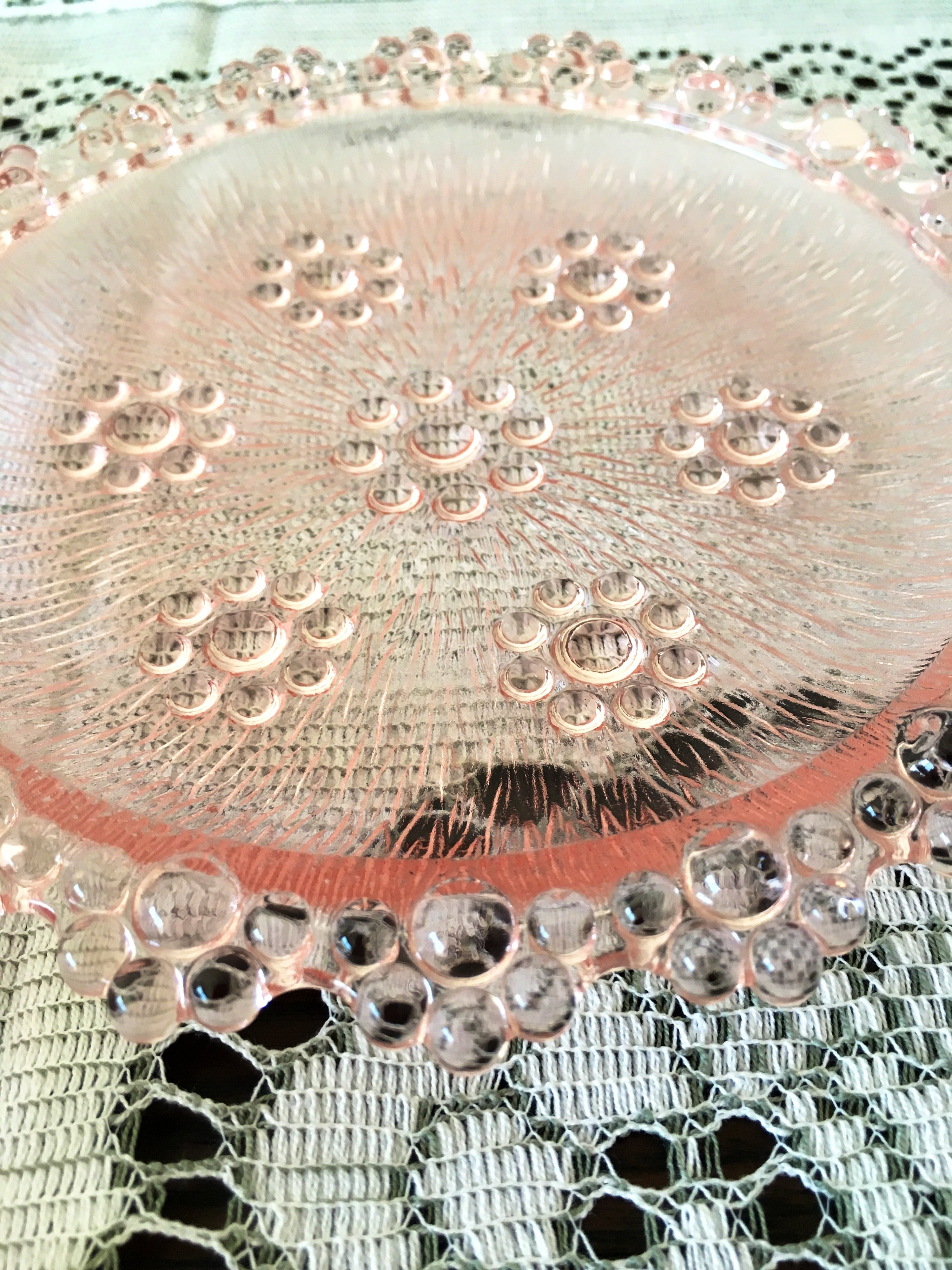 アデリアの人気シリーズ、ピコットのピンク色の中皿です。大きさは、直径17㎝位です。艶のあるつぶつぶの縁とお花模様が可愛らしいお品です。在庫5枚あります。1枚のお値段です。