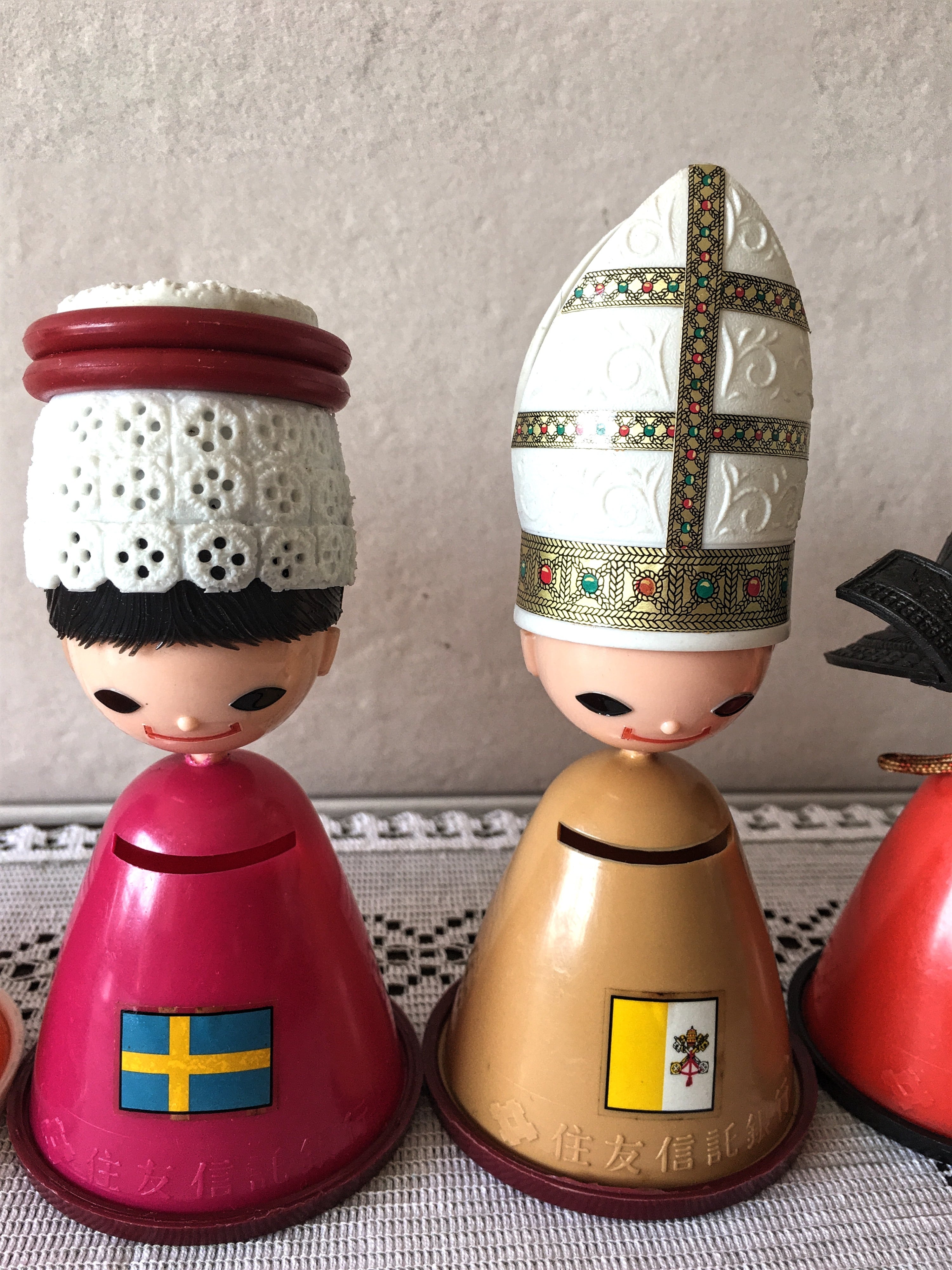 1970年の日本万国博覧会に合わせて住友信託銀行が配布した世界風俗人形の貯金箱です。左から、イギリス、サウジアラビア、ノルウェー、バチカン、日本になります。古い品になる為汚れや傷あります。目立つものとしてはイギリスにシール部分傷あり、日本の兜部分画面右側に破損あります。こちらの兜は黒田長政公のモチーフだそうです。