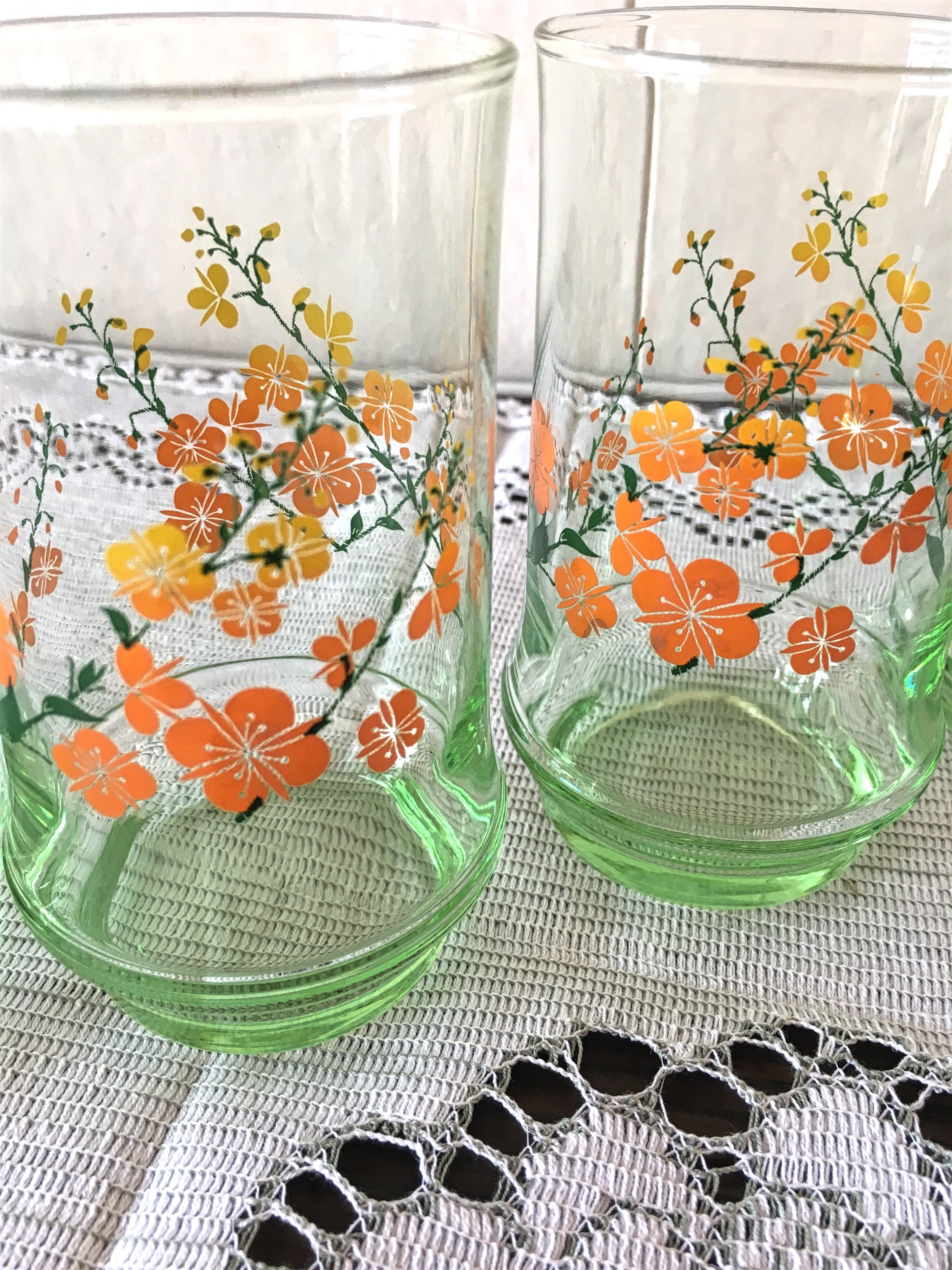 薄いグリーンのガラスにオレンジのお花柄がレトロ可愛いアデリアのグラスです。未使用品で使用傷はありませんが、古いものになりますので、その点お含みおきのほどよろしくお願い申し上げます。