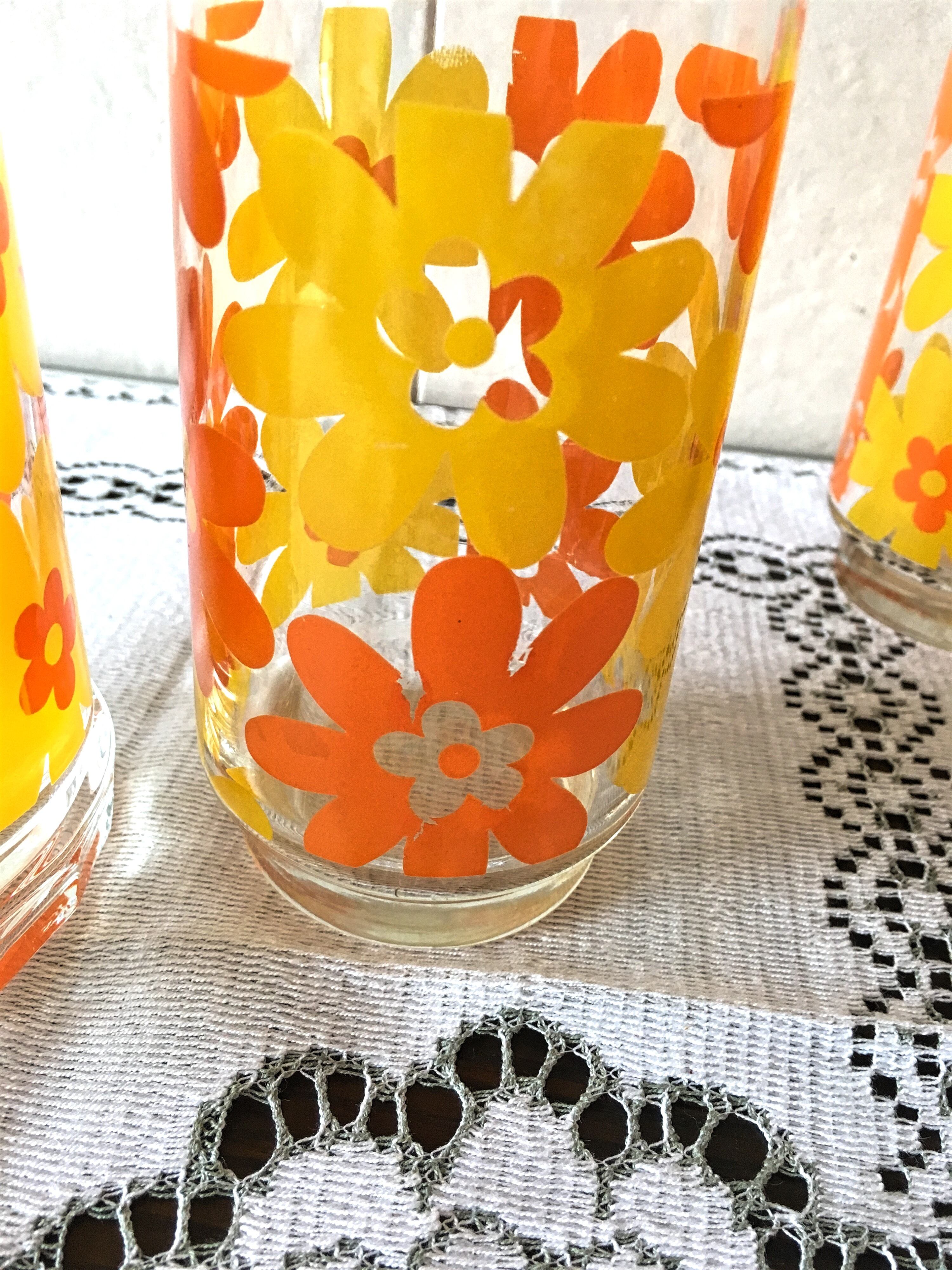 黄色とオレンジの大きな花柄が可愛いグラスとコースターのセットです。割と大きめなので飲み物をたっぷり注げます。グラスは透明ですが、コースターは少しピンクがかったガラス素材です。個体差により、花柄の部分が少し乱れているのがあります。古物である旨ご理解のほどよろしくお願い申し上げます。