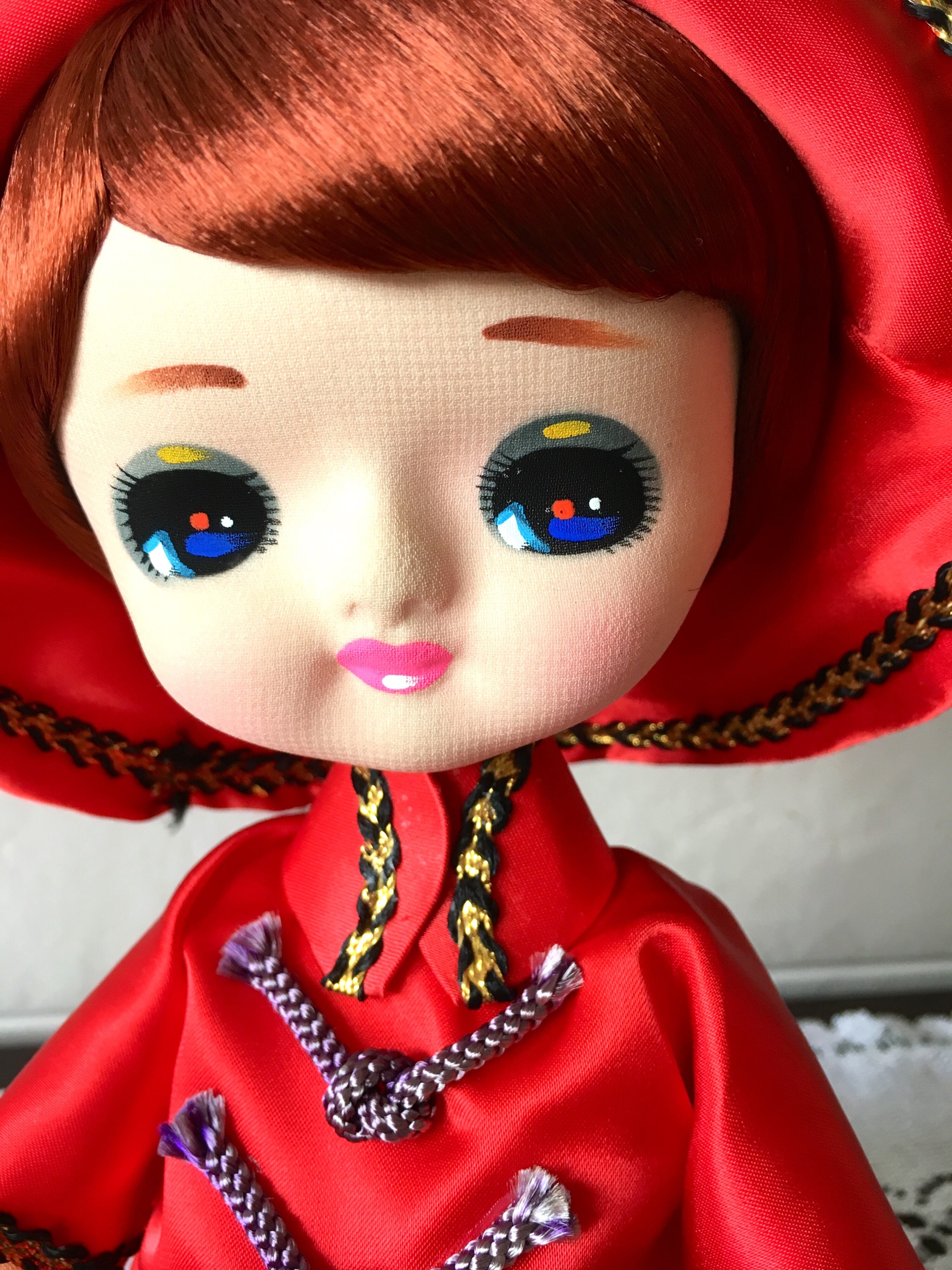 真っ赤なチャイナ服と帽子が可愛い、ポーズ人形です。腕の部分に色むらと少し波うっているところ、首元と頭部にノリの後?のようなものがありますが、お顔の状態は綺麗でとても可愛らしい美人さんです。