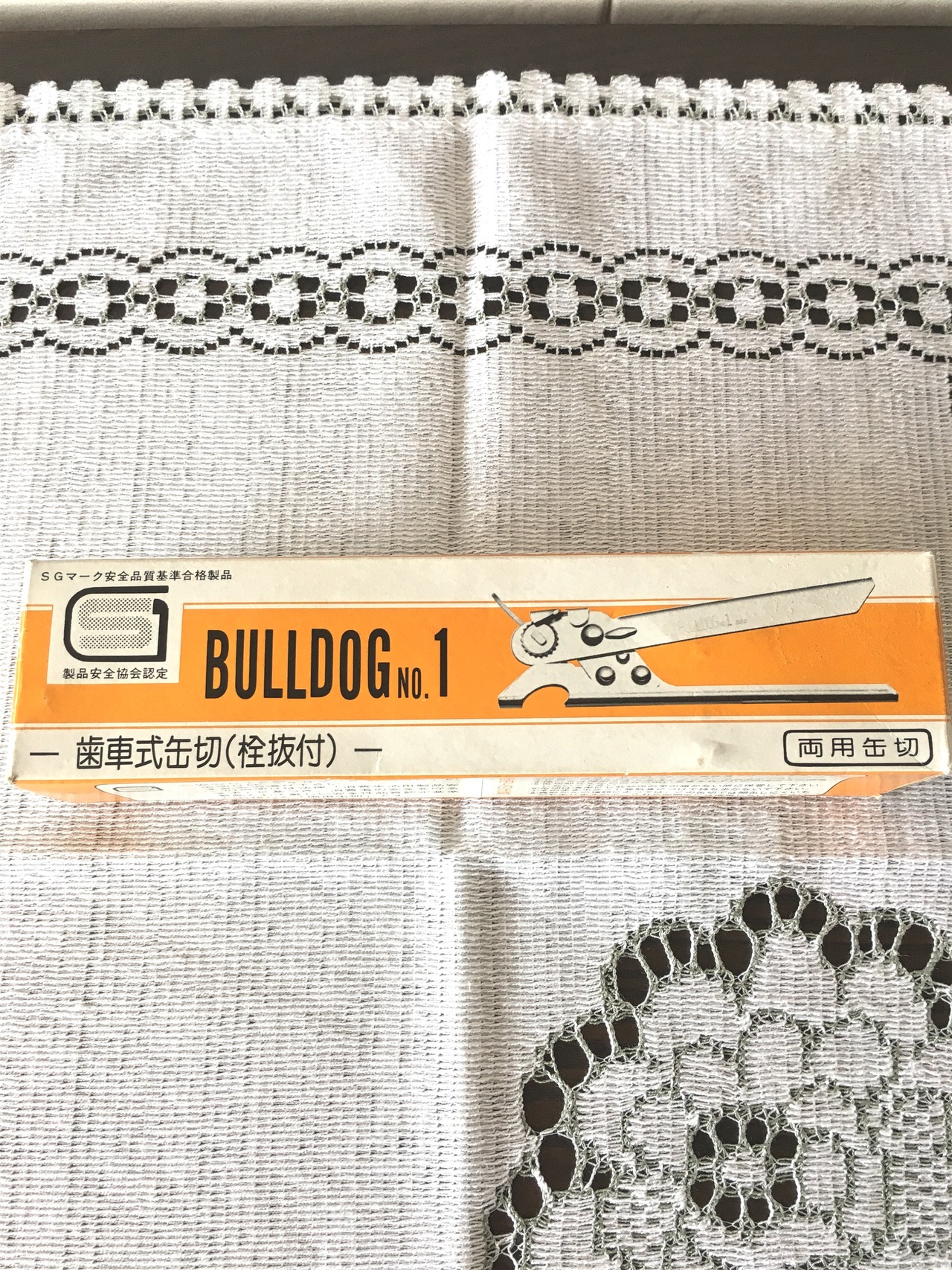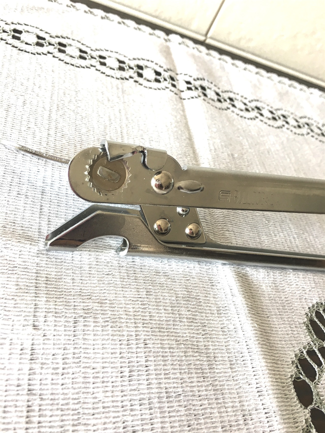 横についた大きなプロペラのような歯車を回す缶切です。栓抜き機能も付いています。工具のペンチみたいでカッコイイです。未使用ですが長期保管品になりますので、古いものにご理解のほどよろしくお願い申し上げます。