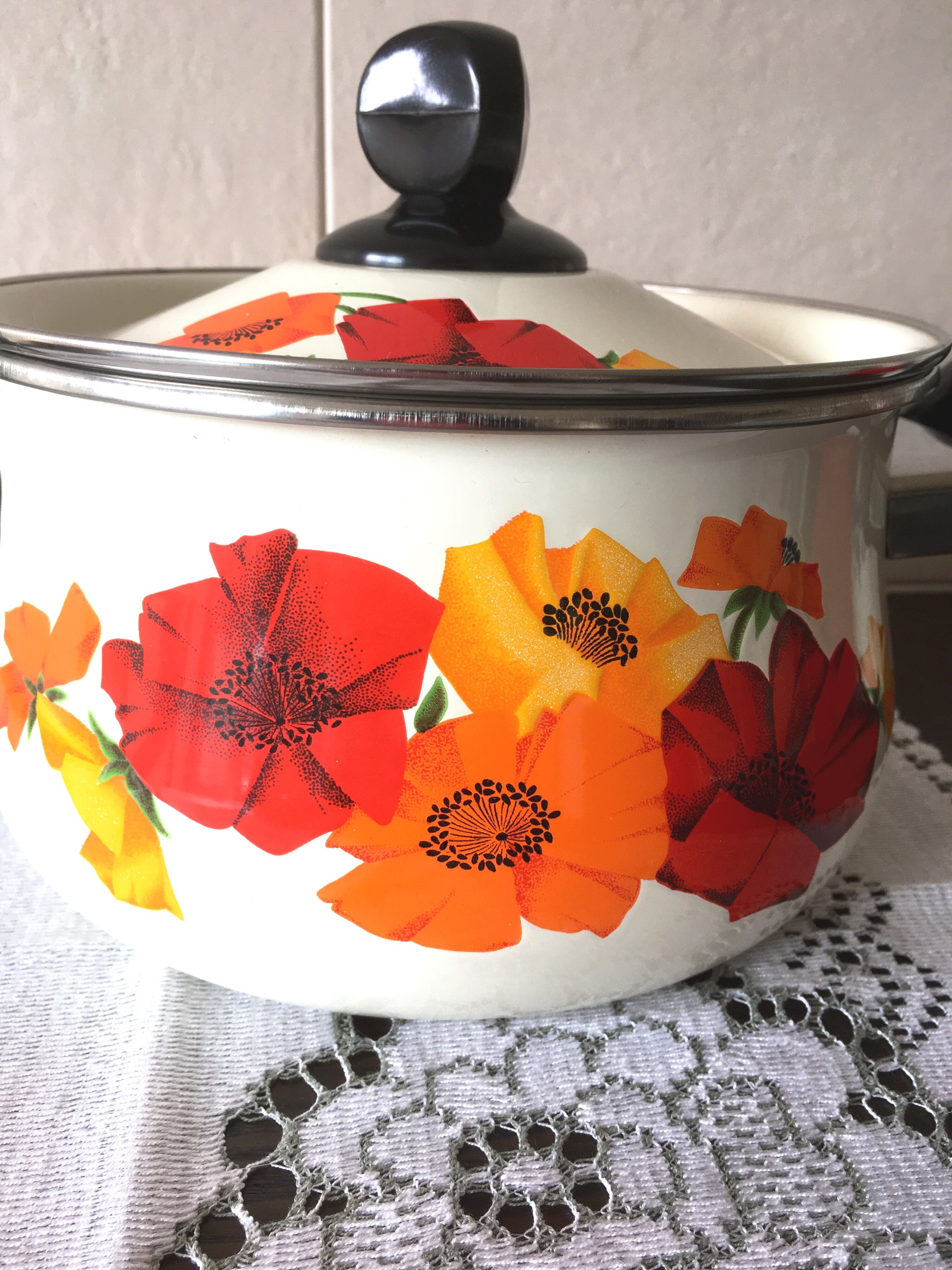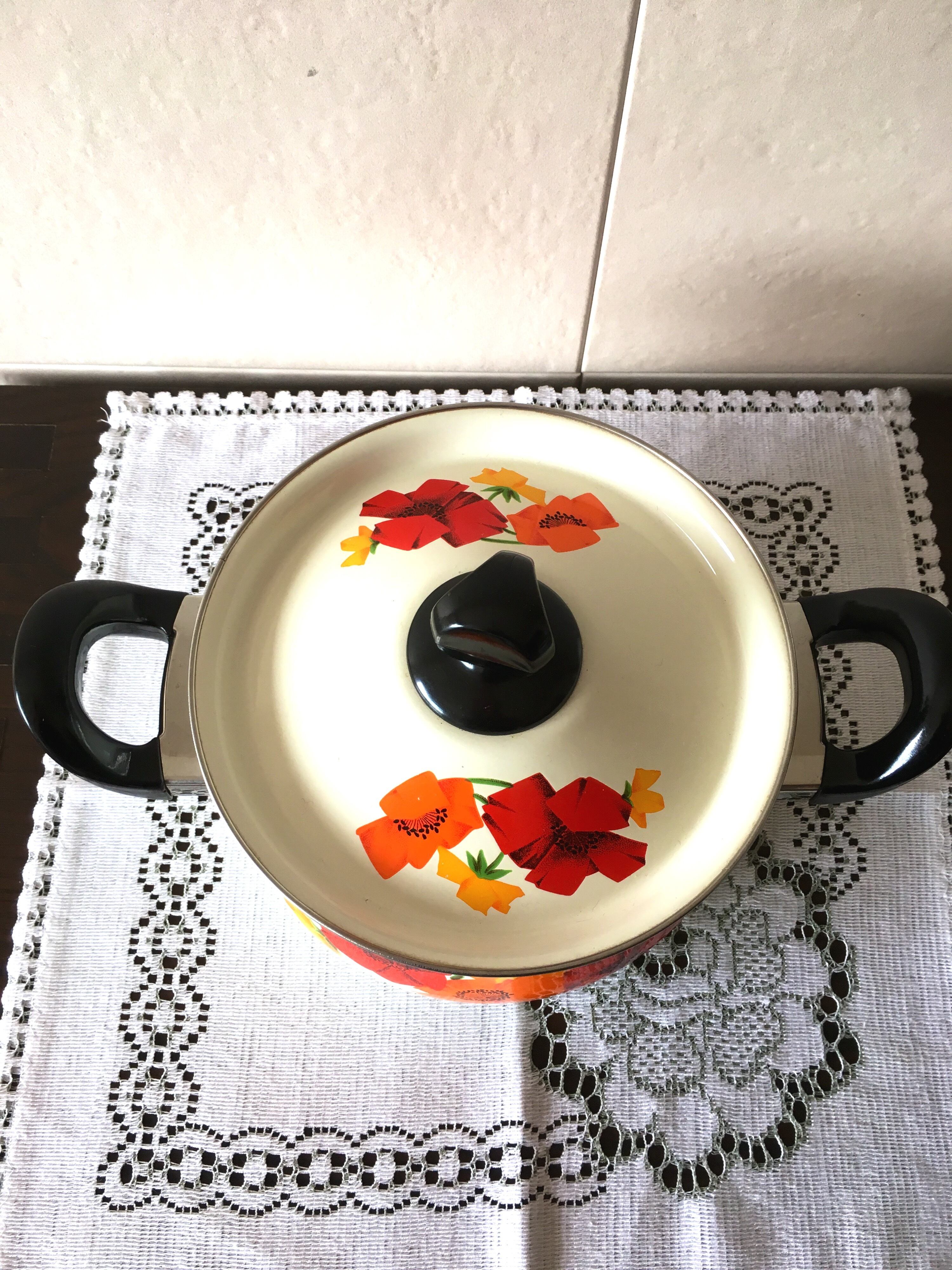 赤とオレンジのお花がレトロ可愛い、琺瑯のお鍋です。持ち手のぽってりした黒も今にはない可愛さです。蓋の持ち手部分は三角形になっていて、持ちやすい構造になっています。カレーや煮物等にちょうどいい大きさです。画像1枚目の後ろに映っている同じく琺瑯の密封瓶も別ページにて販売しております。併せてご検討下さい。