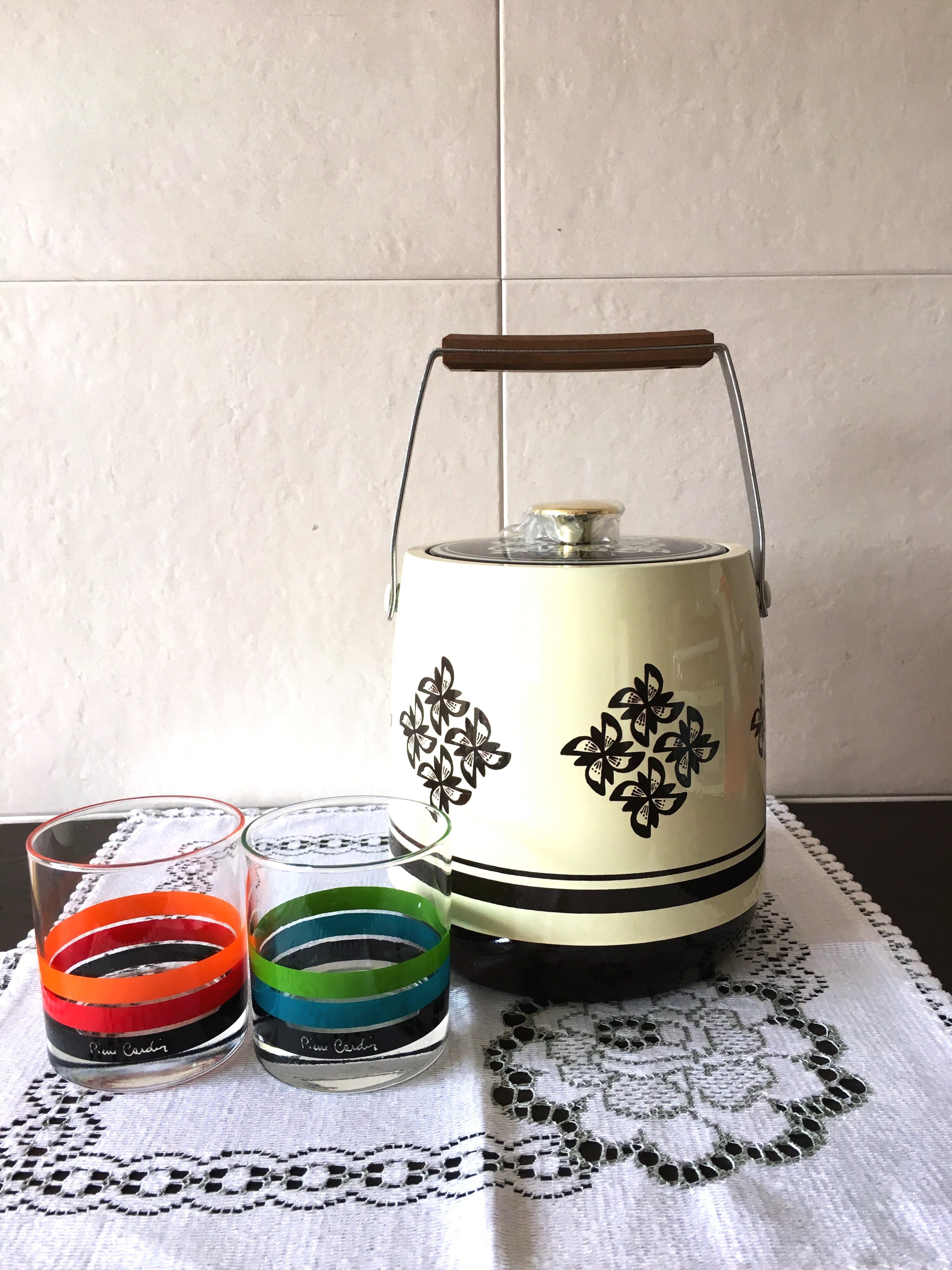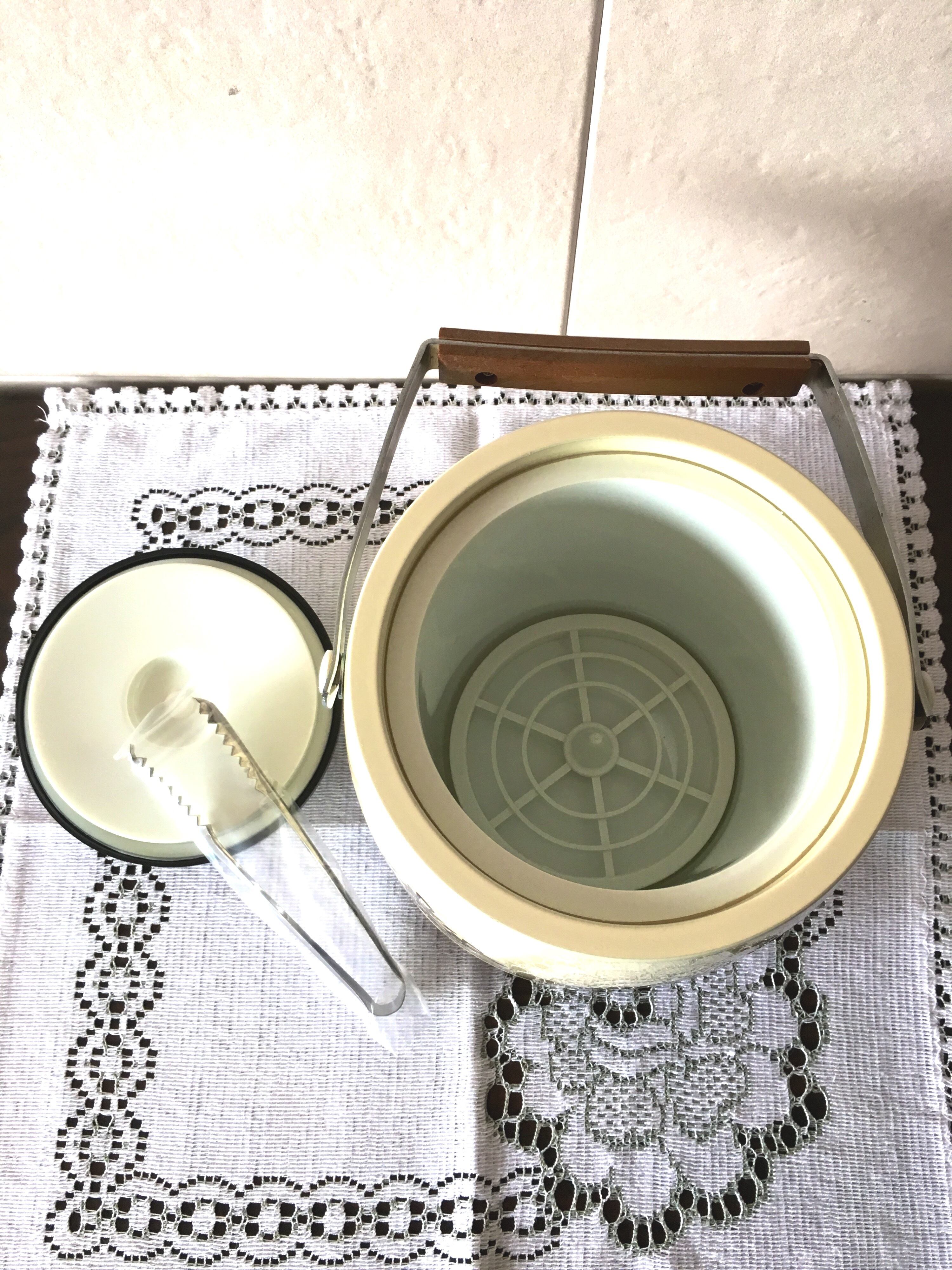 ベージュにブラウンの花柄で北欧の雰囲気を感じる昭和レトロなアイスペールです。落ち着いた色合いなのでインテリアにも合いやすく、彩り豊かなレトログラスにも合わせやすいです。未使用品で、蓋の取っ手と付属のトングにビニールがかかっています。あくまで古いものとしてご理解のほどよろしくお願い申し上げます。