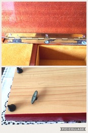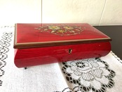 脚付のデザインがエレガントな宝石箱です。中は山吹色のベルベット素材です。ベルベット部分は状態良いですが、金属部分にサビがありますので、ご確認下さい。オルゴール付きですが、残念ながら音はでない状態です。また、鍵穴ありますが鍵はないです。シール等は付いていないですが、イタリア製の象嵌BOXにSANKYOのオルゴールのお品と思われます。ヴィンテージ品である旨ご理解のほどよろしくお願い申し上げます。