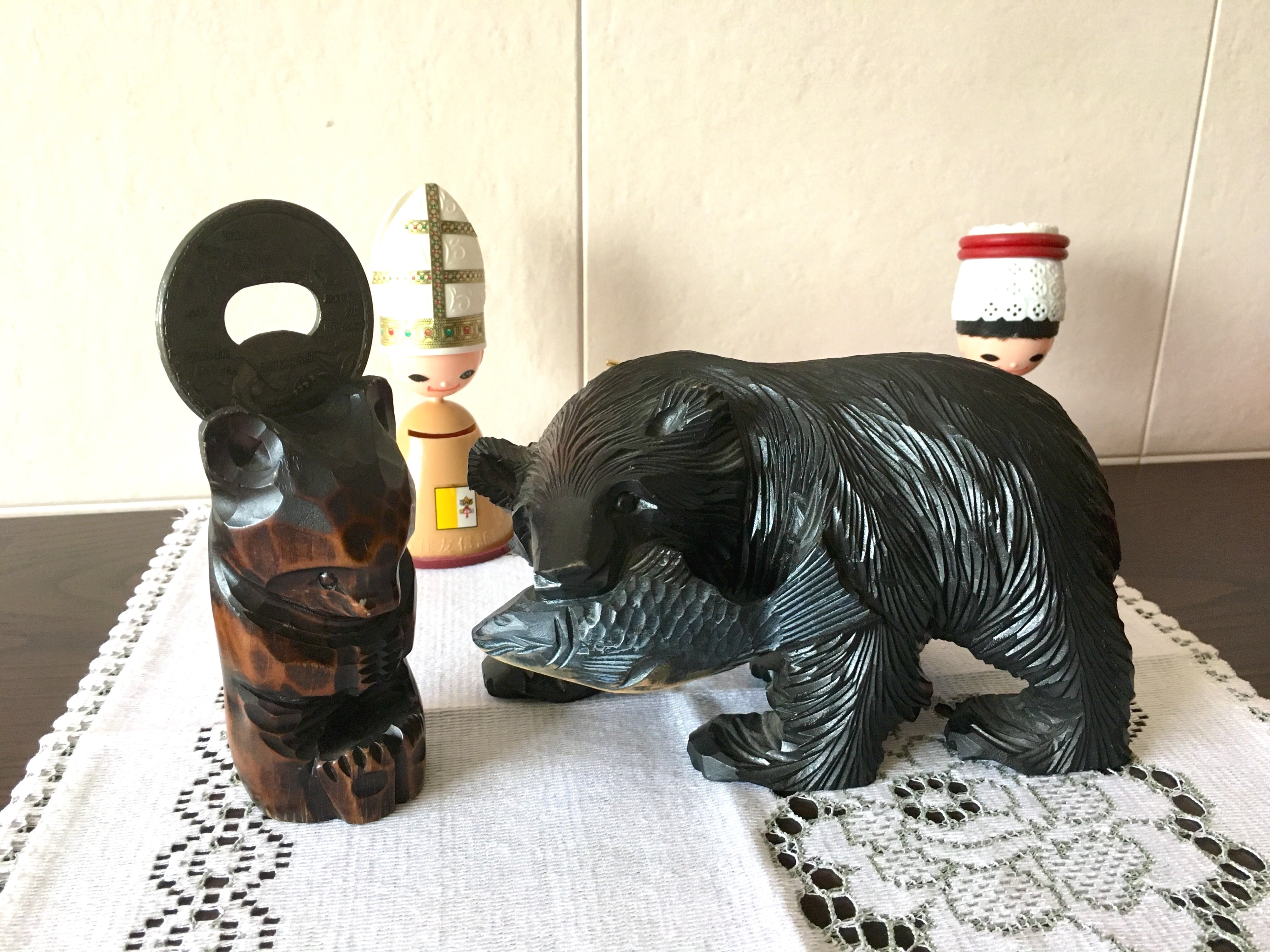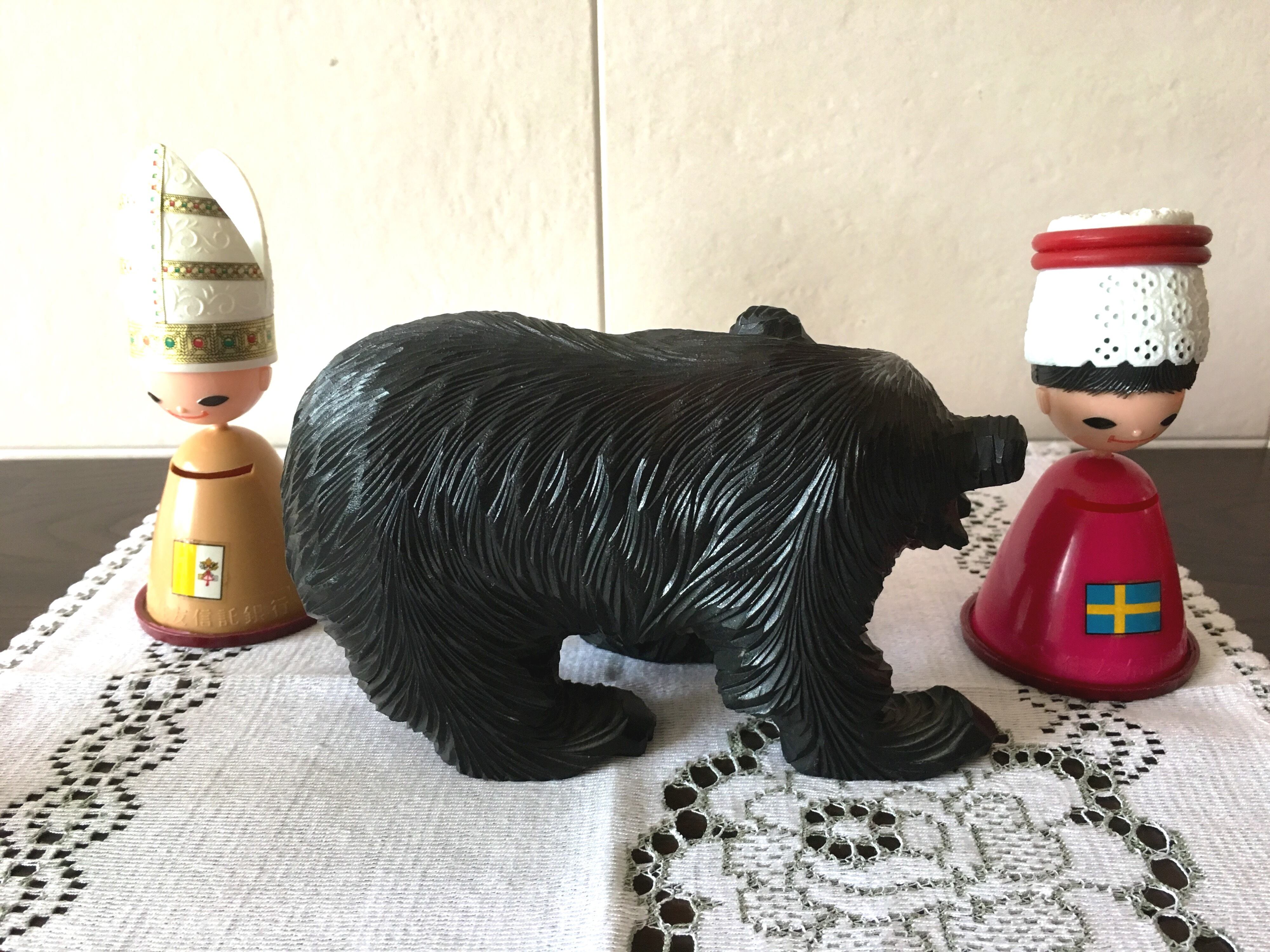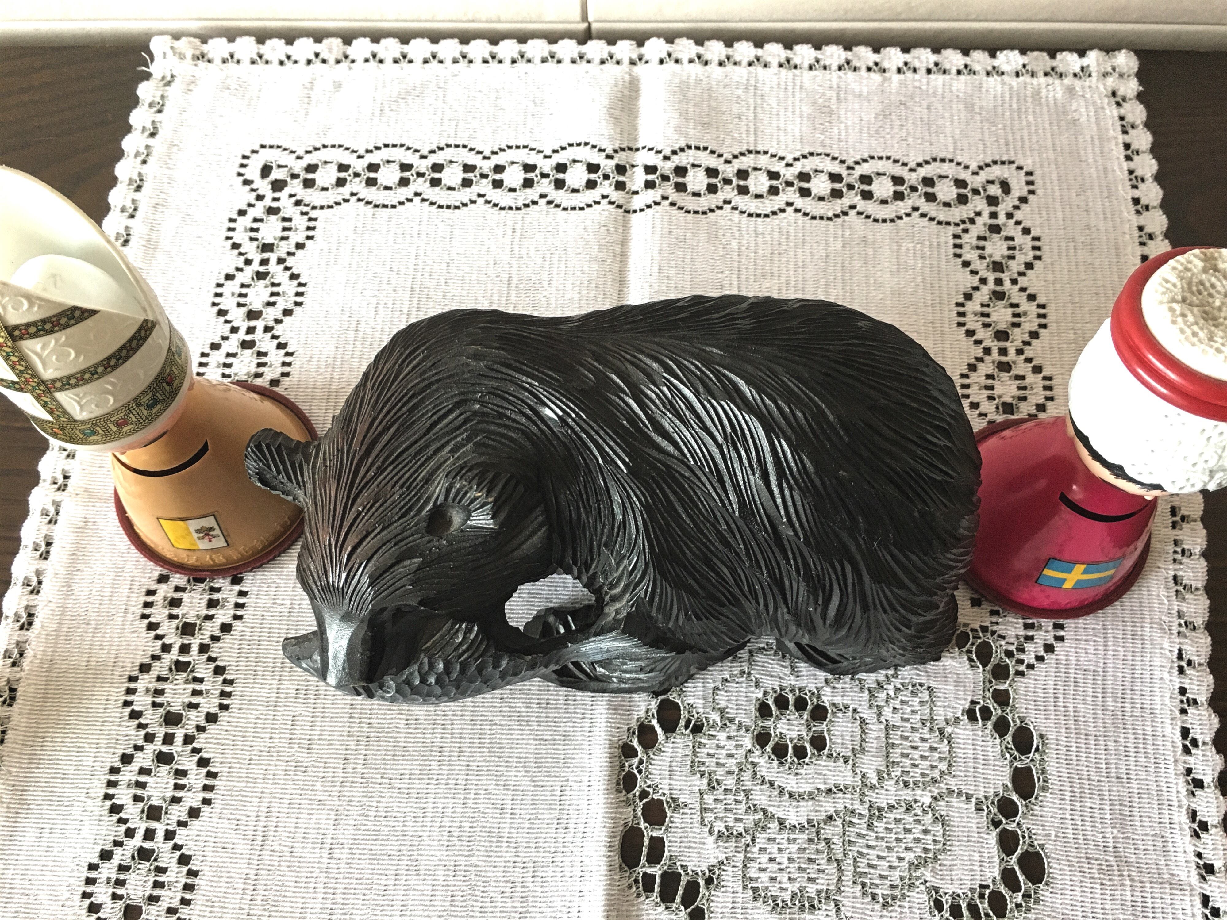 鮭を咥えた、木彫りの熊さんです。サイズがミニサイズということもあり、険しい感じではなく、子熊さんかな?と思える可愛さです。以外とインテリアに馴染むお品で、木彫りの素朴な雰囲気を与えてくれます。北欧系お好きな方も是非ご検討ください^ ^。