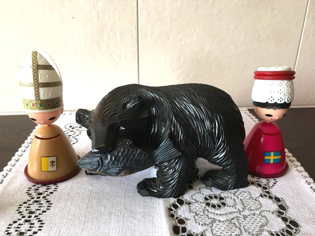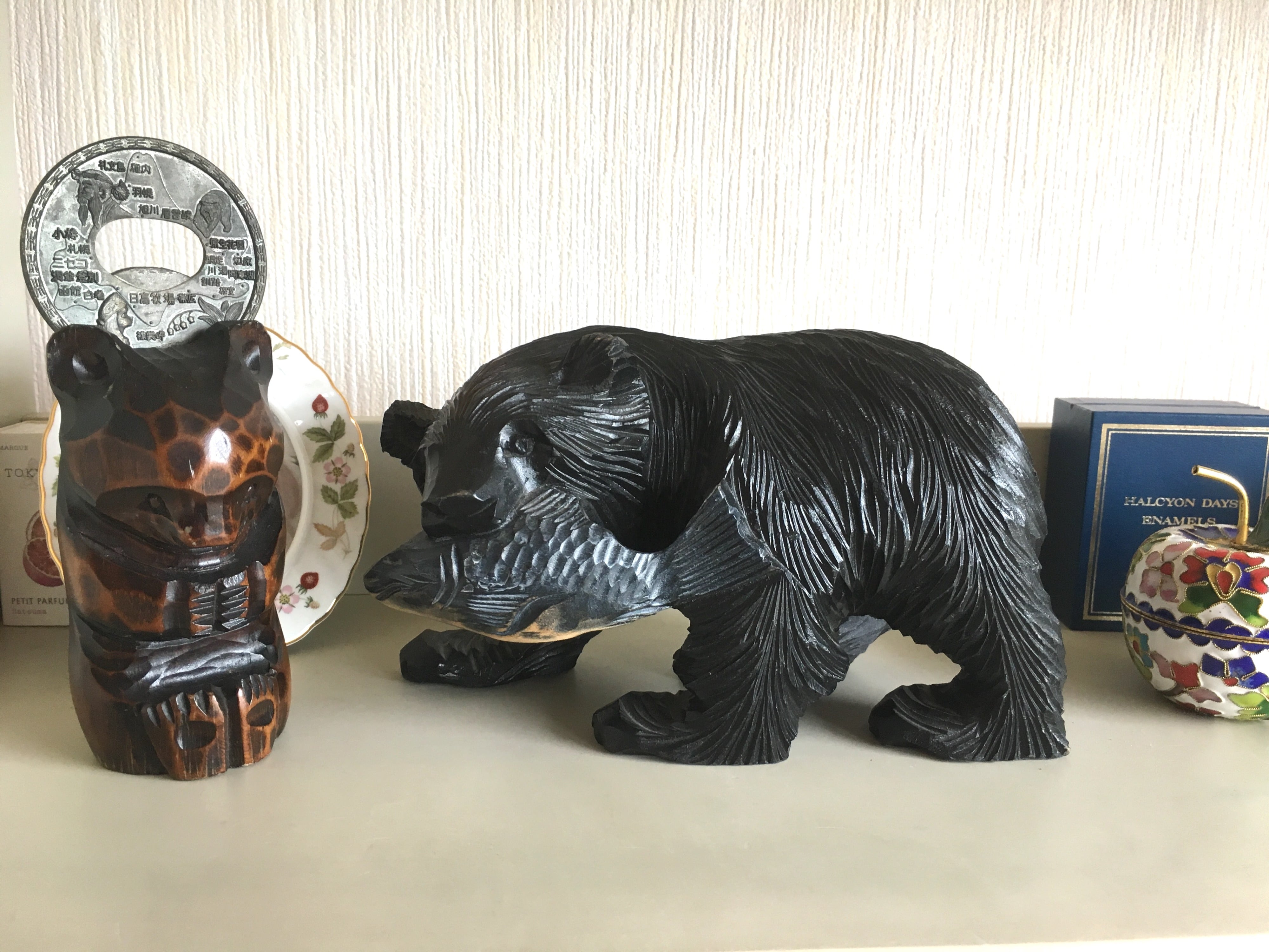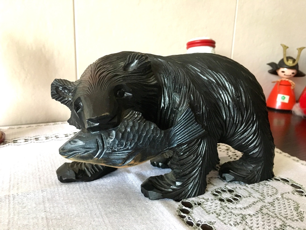 鮭を咥えた、木彫りの熊さんです。サイズがミニサイズということもあり、険しい感じではなく、子熊さんかな?と思える可愛さです。以外とインテリアに馴染むお品で、木彫りの素朴な雰囲気を与えてくれます。北欧系お好きな方も是非ご検討ください^ ^。